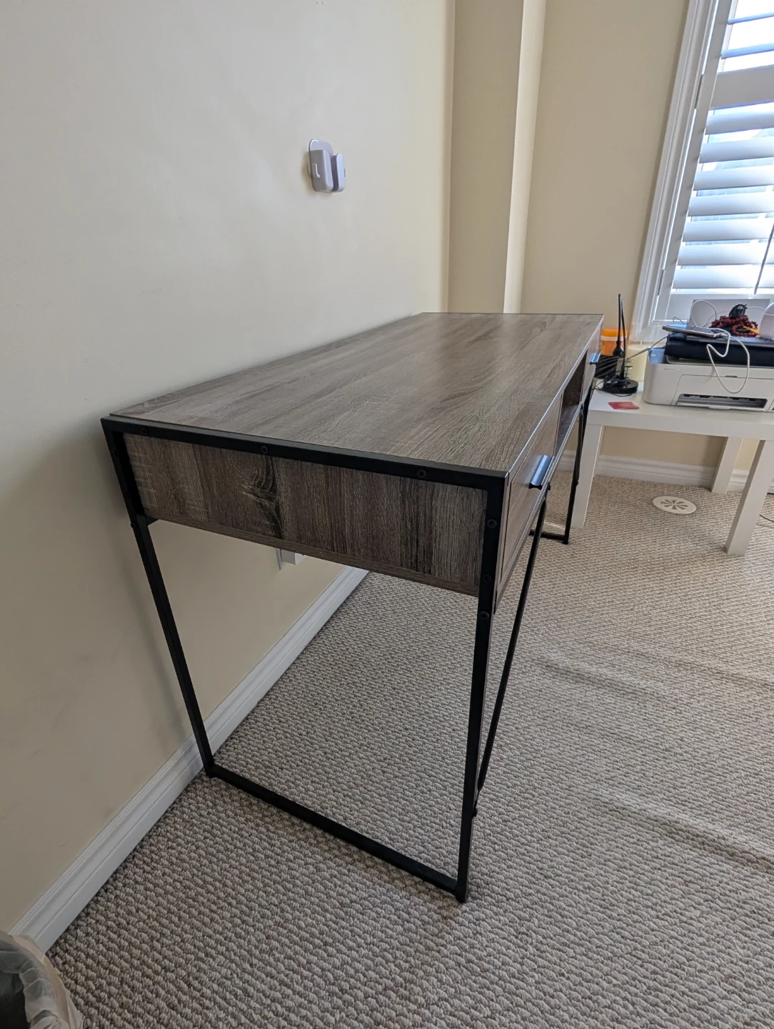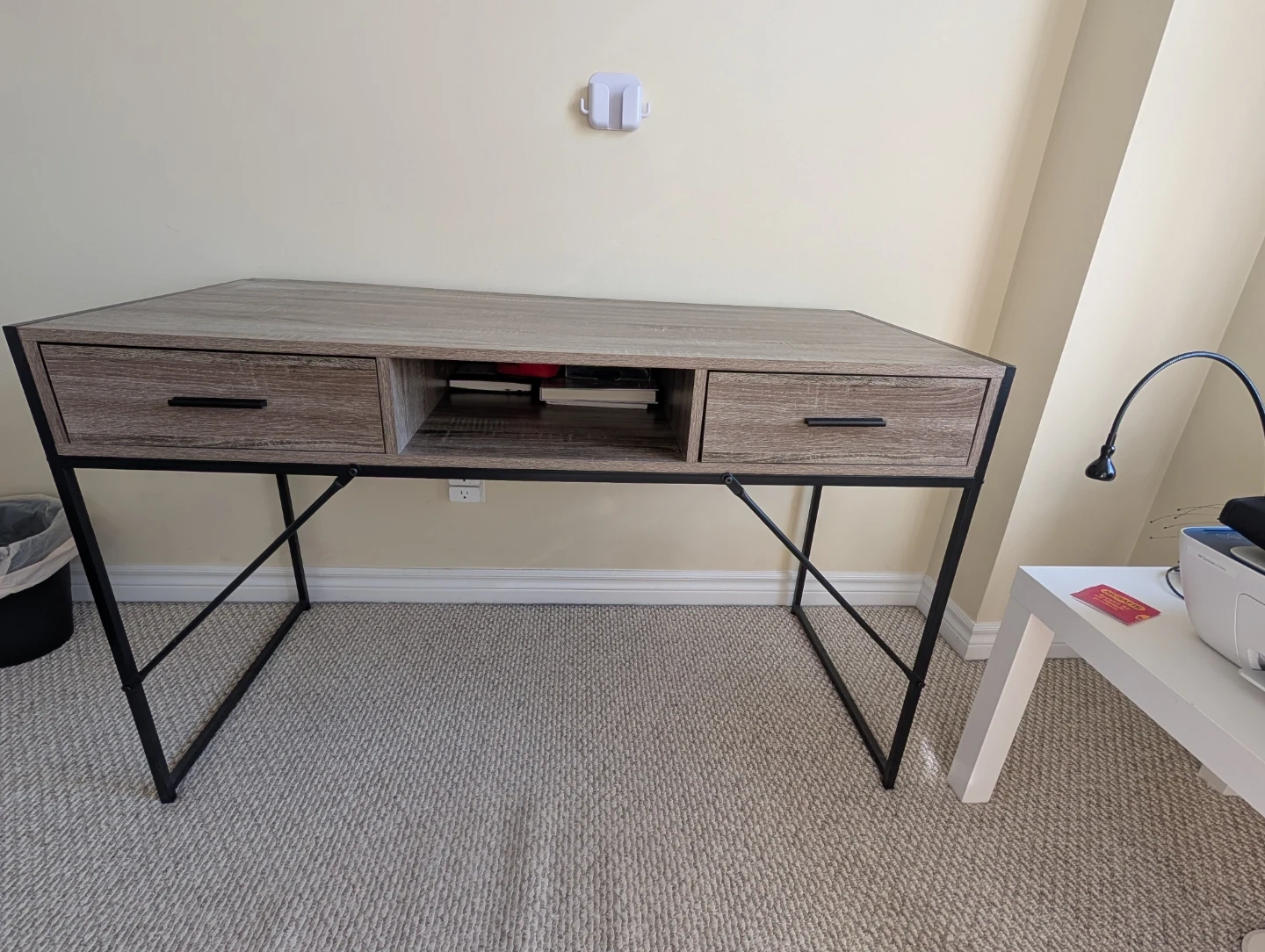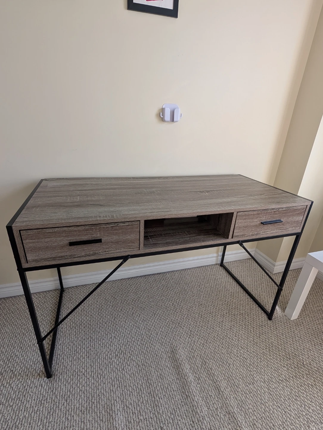 Selling a simple wood and metal desk! It has a nice industrial look with the black metal frame and wood-look top. It features two drawers for storage and an open shelf in the middle. Perfect for a home office or student!
