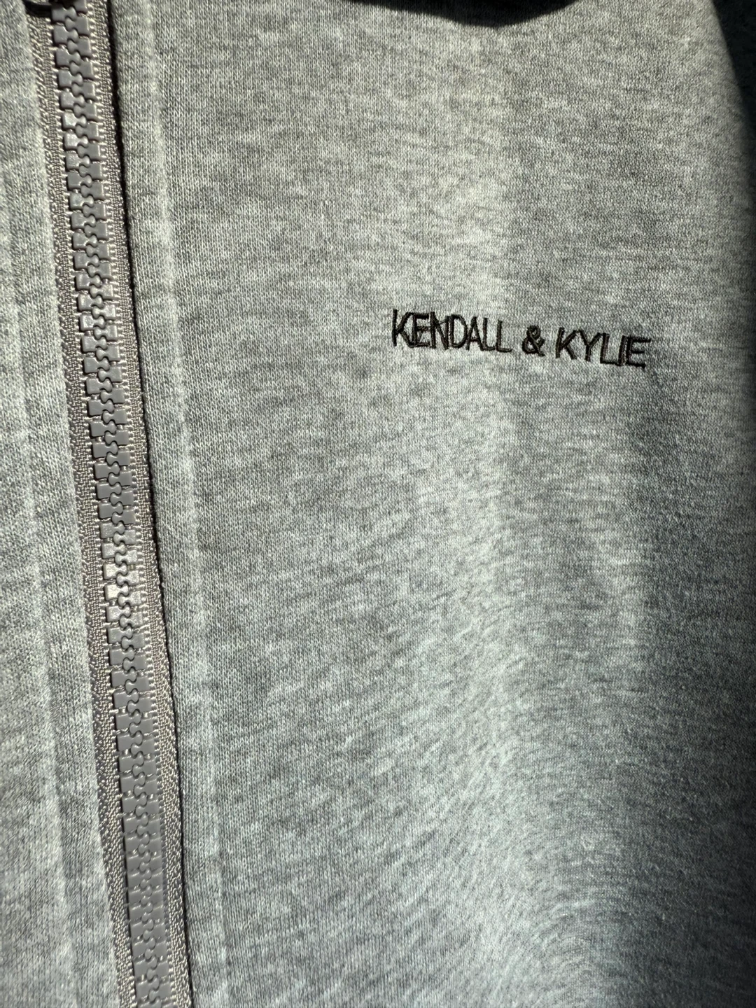 Selling a Kendall & Kylie zip-up hoodie in size large. It's a lovely grey colour, perfect for layering or wearing on its own. The hoodie is in great condition and has a comfortable fit! It features the Kendall & Kylie logo embroidered on the front.