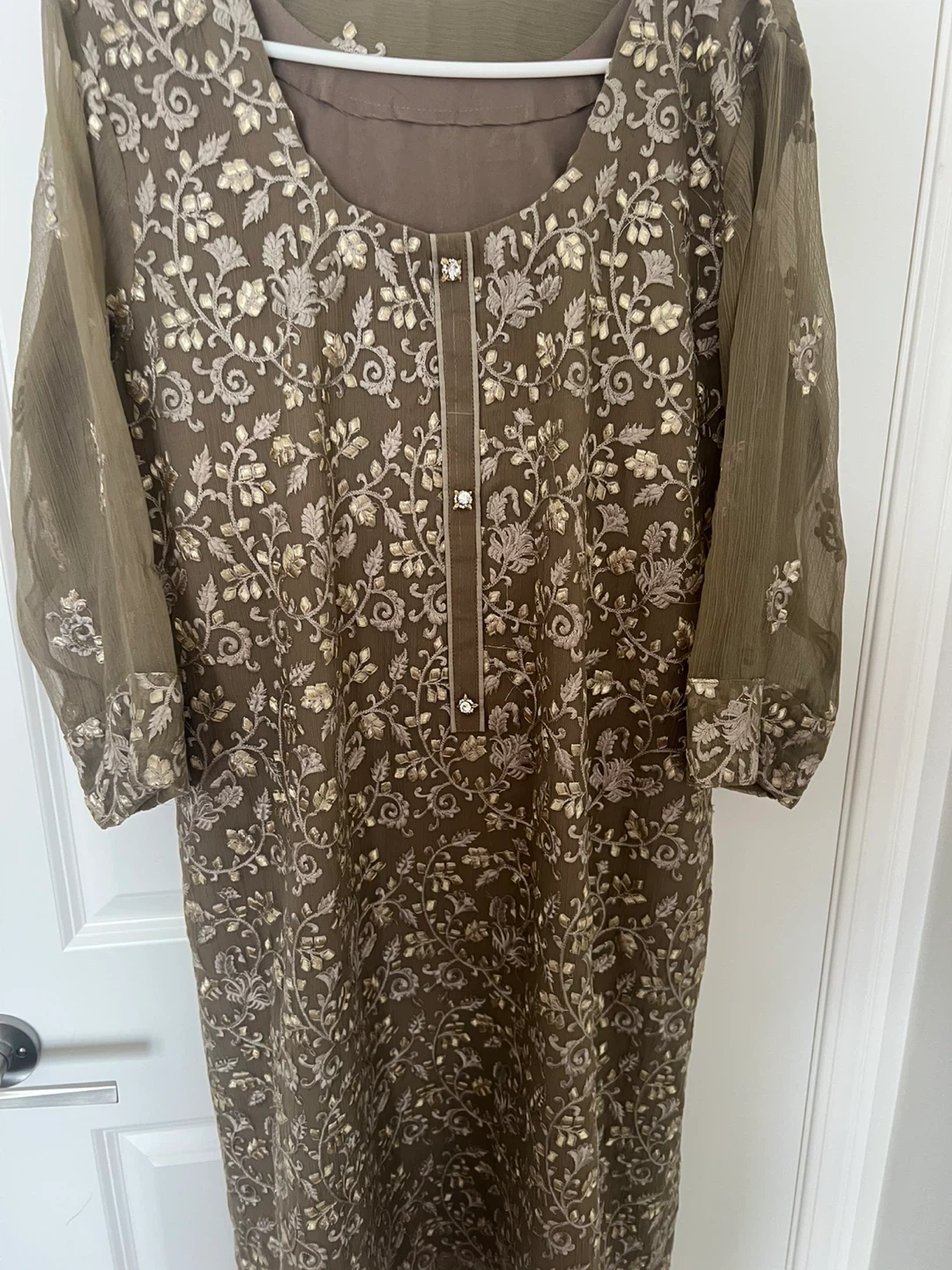 Beautiful gray salwar kameez with intricate embroidery. This set includes the kameez (tunic), salwar (pants), and dupatta (scarf). It's in great condition and perfect for special occasions or everyday wear.