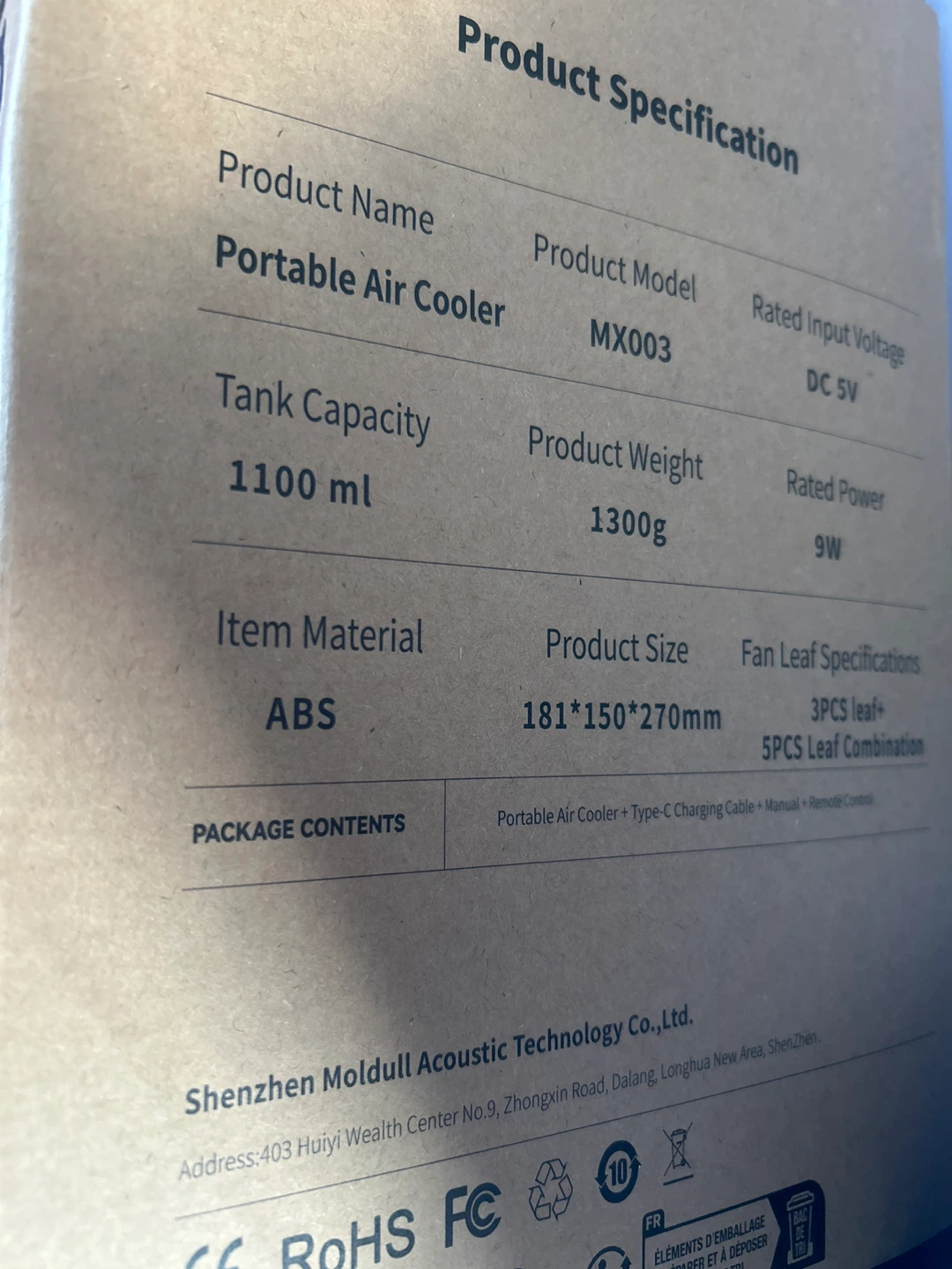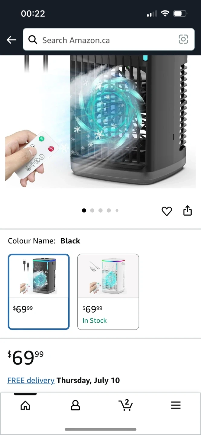 I'm selling a portable air cooler in black. It comes with a Type-C charging cable, manual, and remote control.