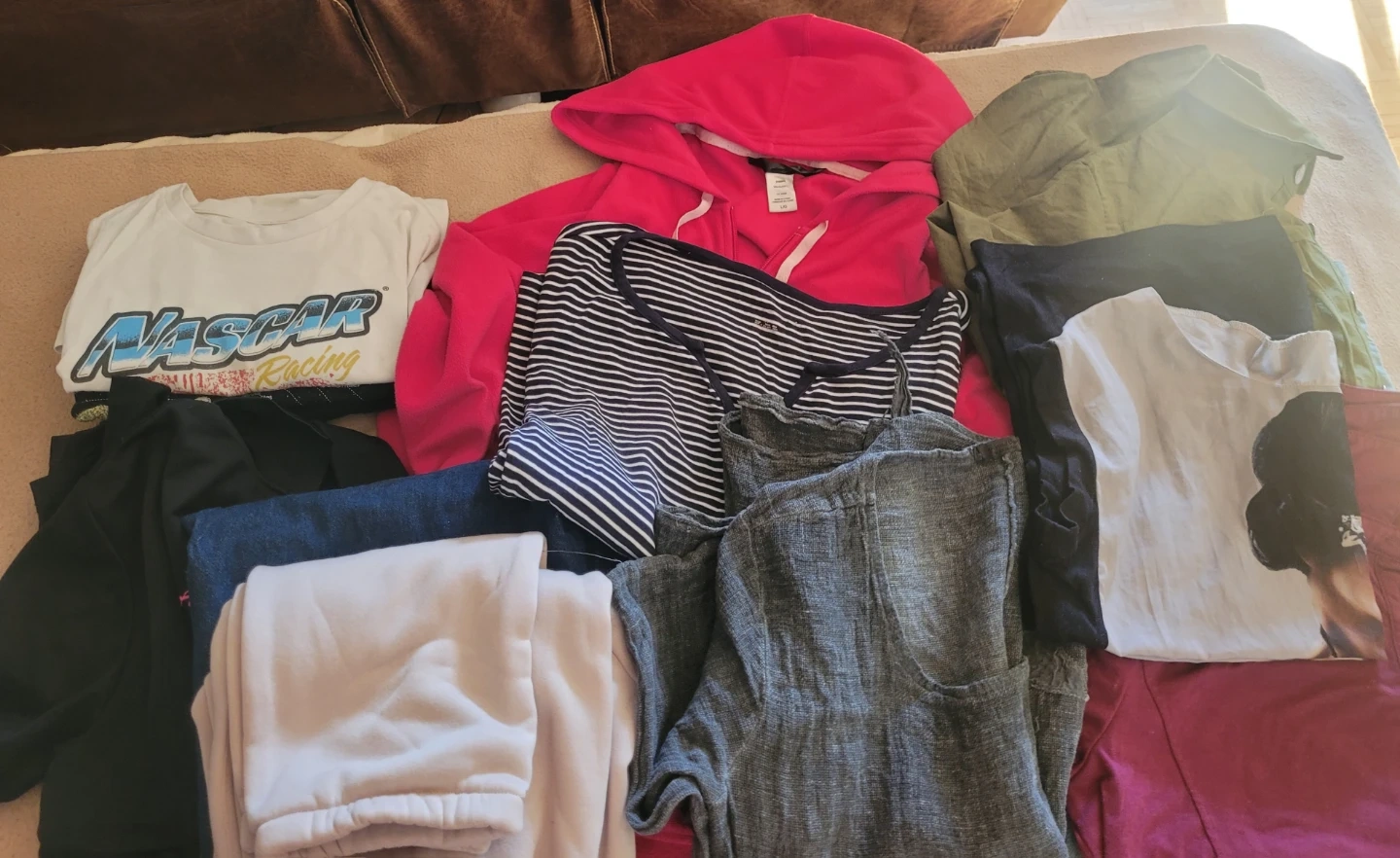 Selling a bundle of assorted clothing items. There's a variety of colours and styles, including a NASCAR Racing t-shirt for boys', a pink hoodie, a striped Tommy Hilfiger t-shirt, and more! Great for expanding your wardrobe with some new pieces