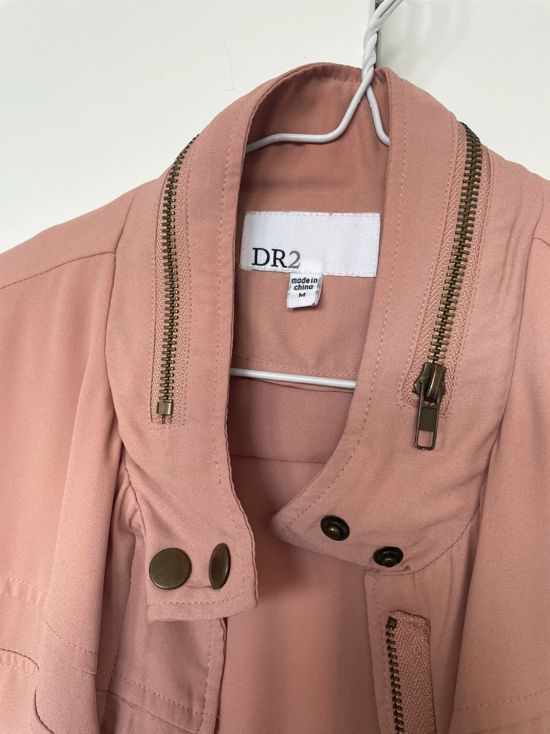 A cute pink light jacket from DR2! The tag says it's made of 100% polyester. Perfect for layering!