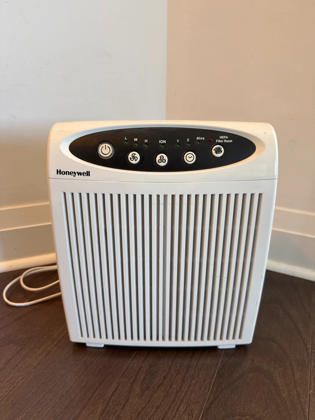 Small Room Honeywell HEPA air purifier! It has multiple settings including low, medium, high, and an ion setting.