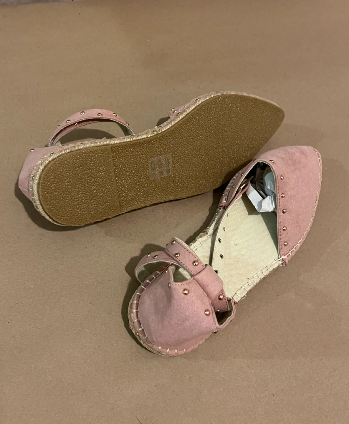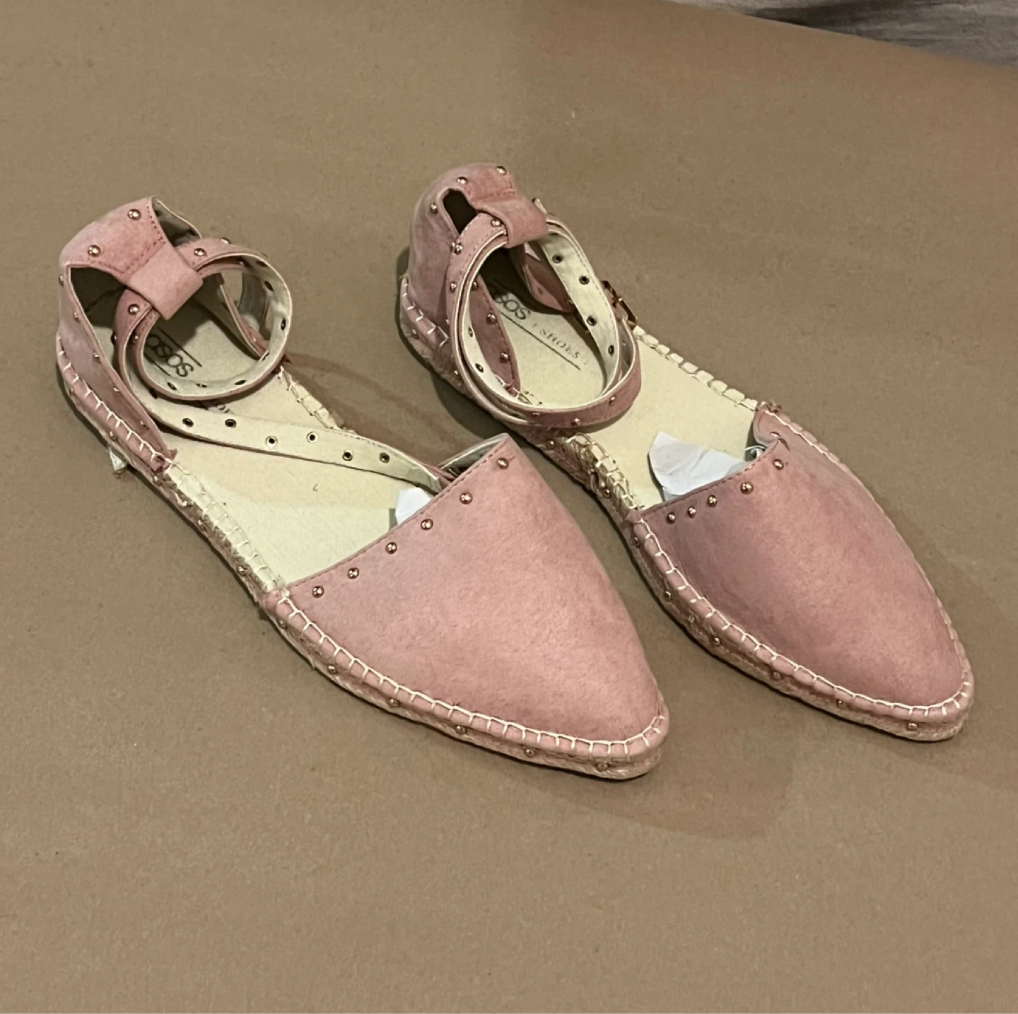 Pair of brand new pink suede-like ASOS espadrille sandals. They feature an ankle strap and gold stud detailing. Size 8