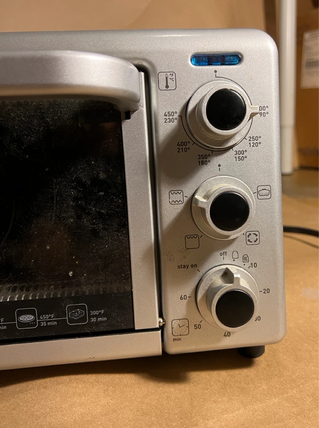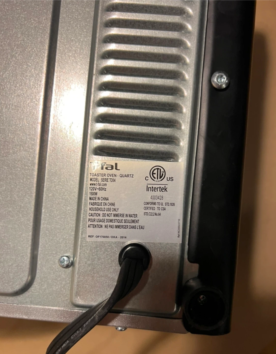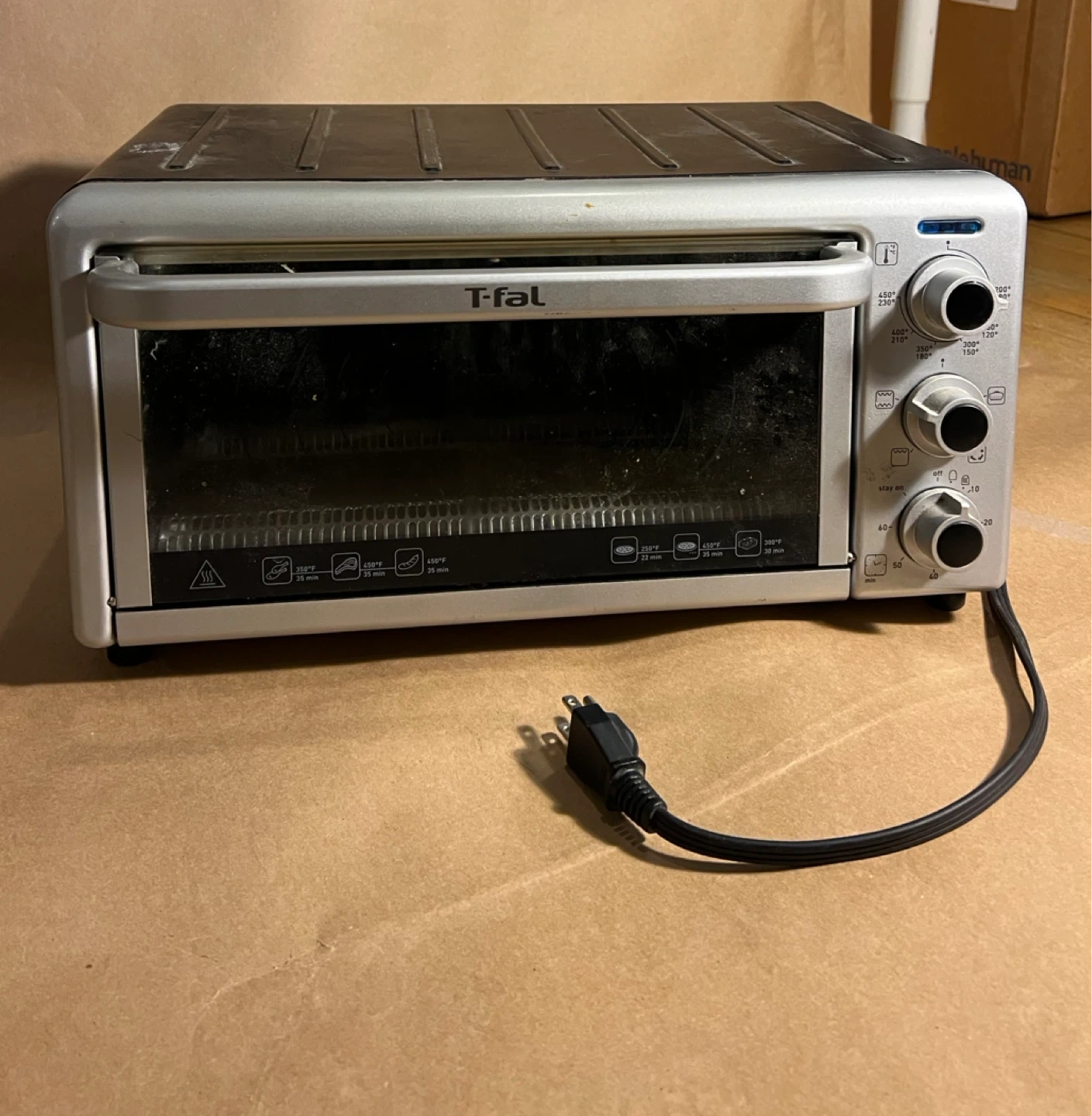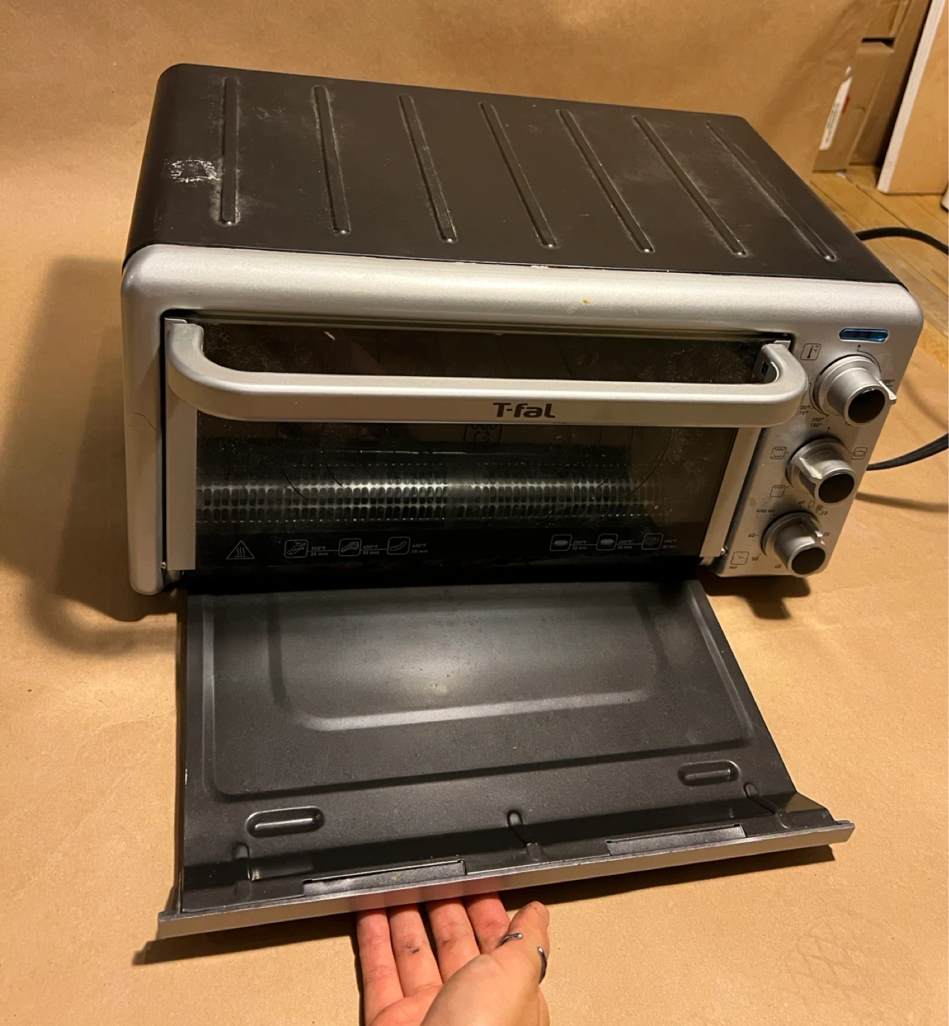 Selling a used T-fal toaster oven. Missing the rack insert. Has been cleaned since this photo was taken; works well. See final picture for the model number if you want to look it up