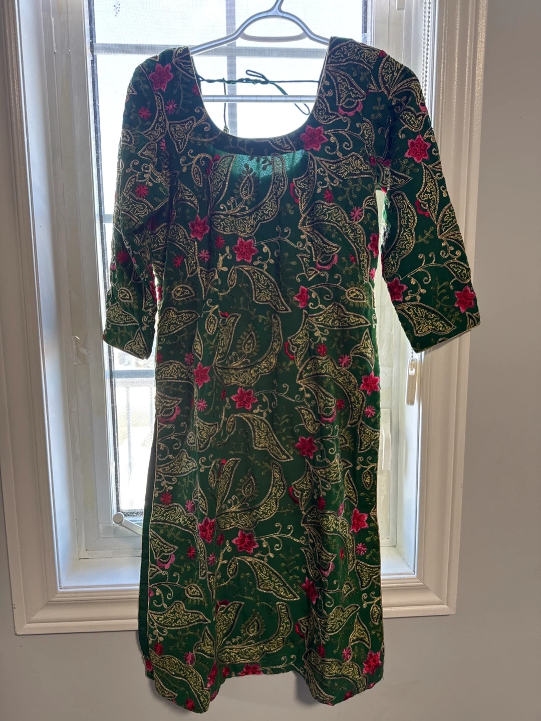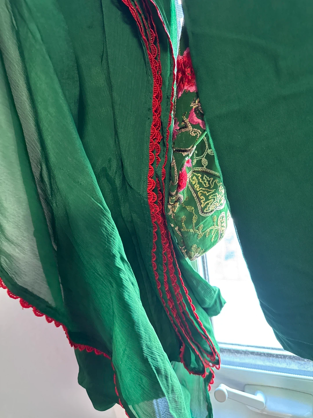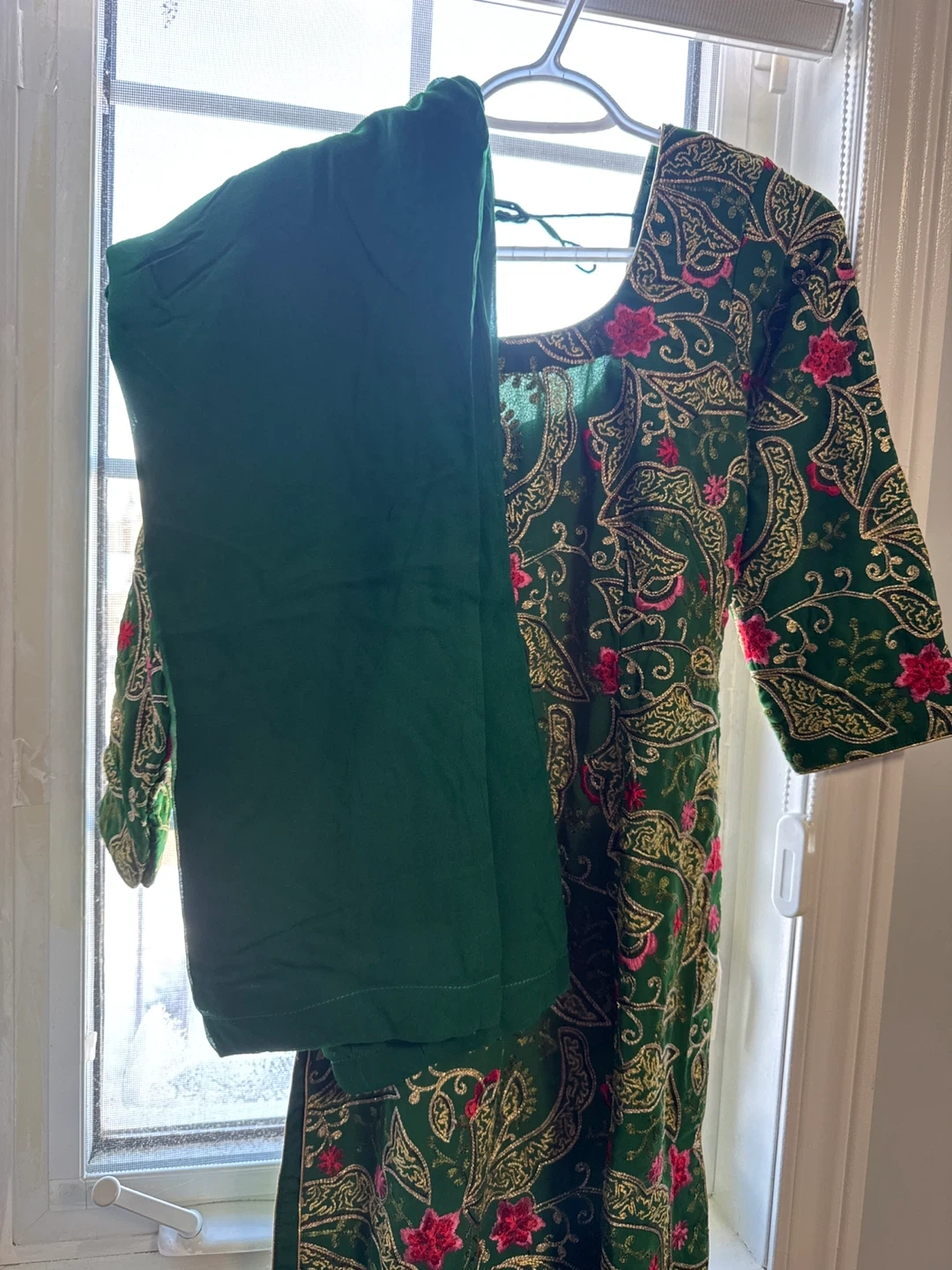 Beautiful green pant, kameez suit with intricate embroidery. Perfect for special occasions or everyday wear. The fabric is lightweight and comfortable, making it ideal for the warmer weather. This set includes the kameez (tunic), salwar (pants), and dupatta (scarf).