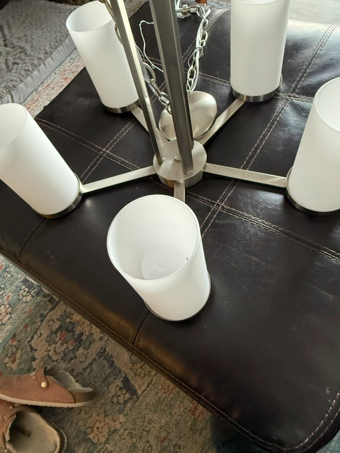 Selling a stylish 5-light chandelier! It features a sleek silver finish and frosted white shades. Perfect for adding a touch of modern elegance to any room in your home. It's in great condition and ready to brighten up your space!