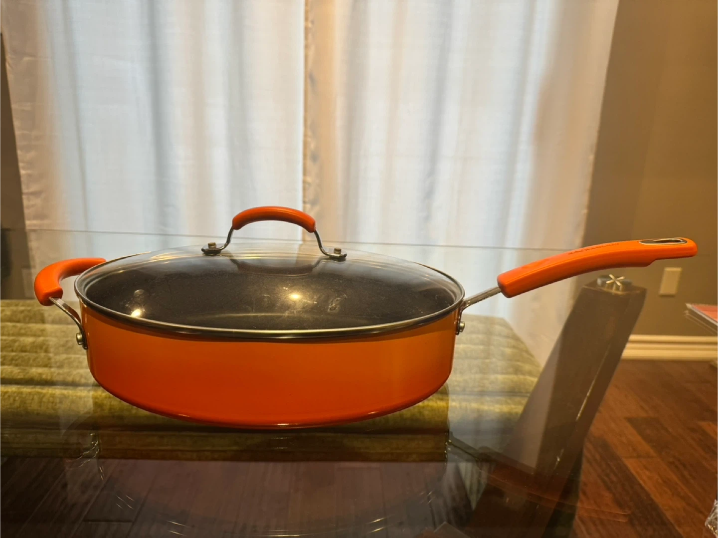 Gently used 5-quart capacity pan. The unique oval shape is great for stovetop space and fits long pasta or large cuts of meat perfectly. Non-stick surface is very clean. Includes matching glass lid.
