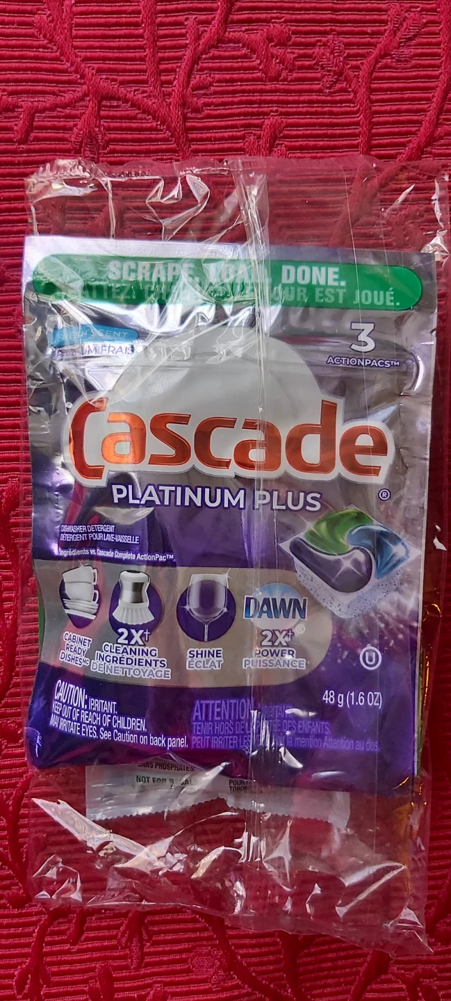 Selling Cascade Platinum Plus Actionpacs dishwasher detergent. These powerful packs leave your dishes cabinet-ready with 2x cleaning ingredients and shine. Each pack contains Dawn for extra power and radiance. The pack contains 3 Actionpacs.