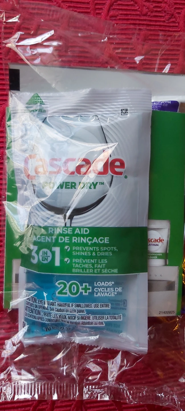 Selling a new package of Cascade Power Dry Rinse Aid! It prevents spots, shines, and dries your dishes. Good for 20+ loads