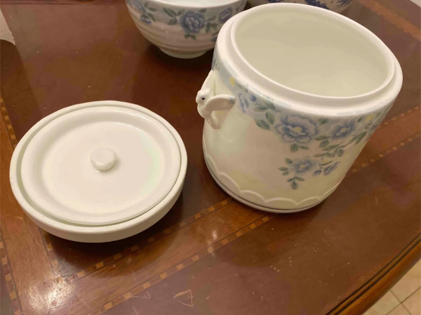 Selling a lovely vintage ceramic jar with a lid. It features a delicate floral design and a cute bird detail on the handle. Perfect for adding a touch of vintage charm to your kitchen or as a decorative piece!