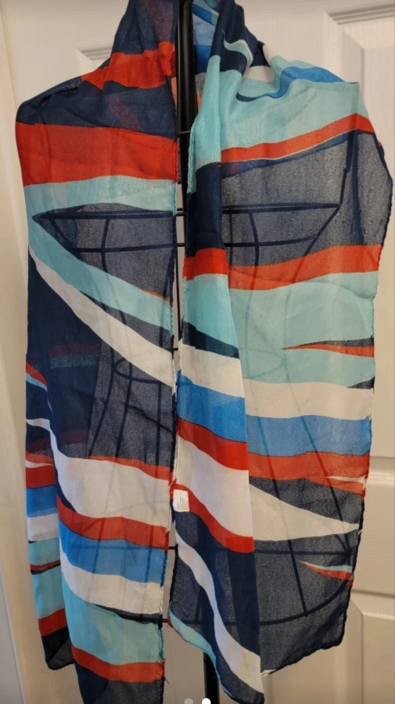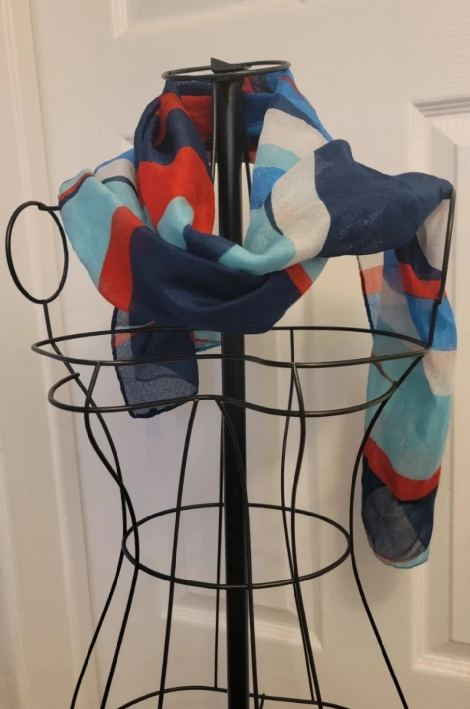 Selling a colourful striped scarf! It features a mix of blue, red, and white stripes in a lightweight material. Perfect for adding a pop of colour to any outfit!