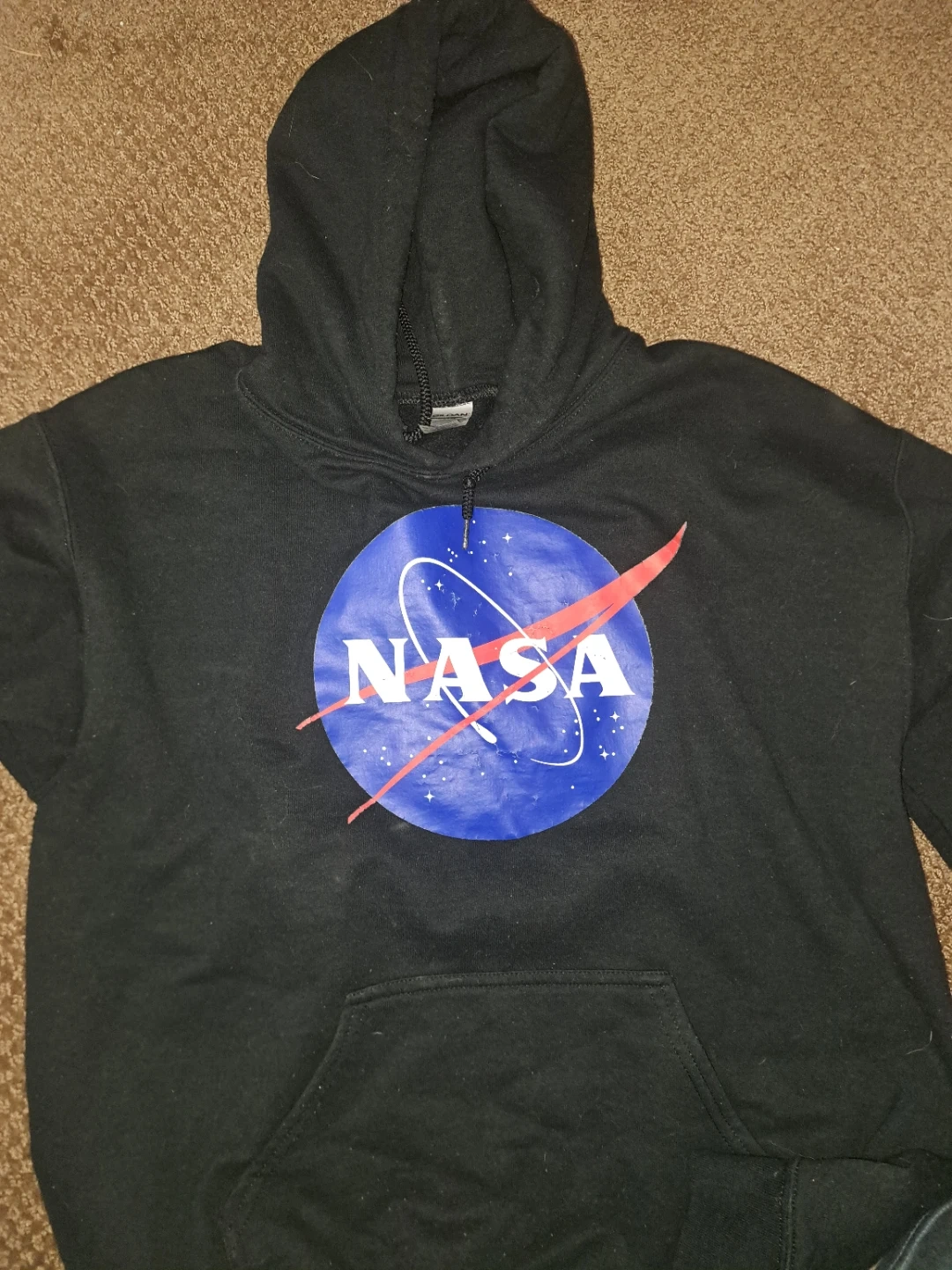 Selling a black Gildan hoodie featuring the NASA logo! It's a size medium and in good condition. Perfect for anyone who loves space or wants a comfy hoodie for everyday wear