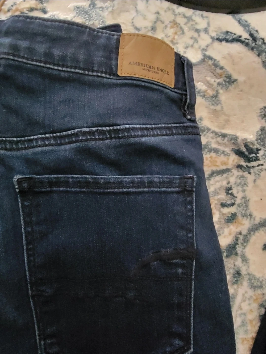 Selling a pair of American Eagle Outfitters jeans in size 6. They are a dark wash denim and in standard length. The material is a blend of cotton, viscose, polyester, and elastane.