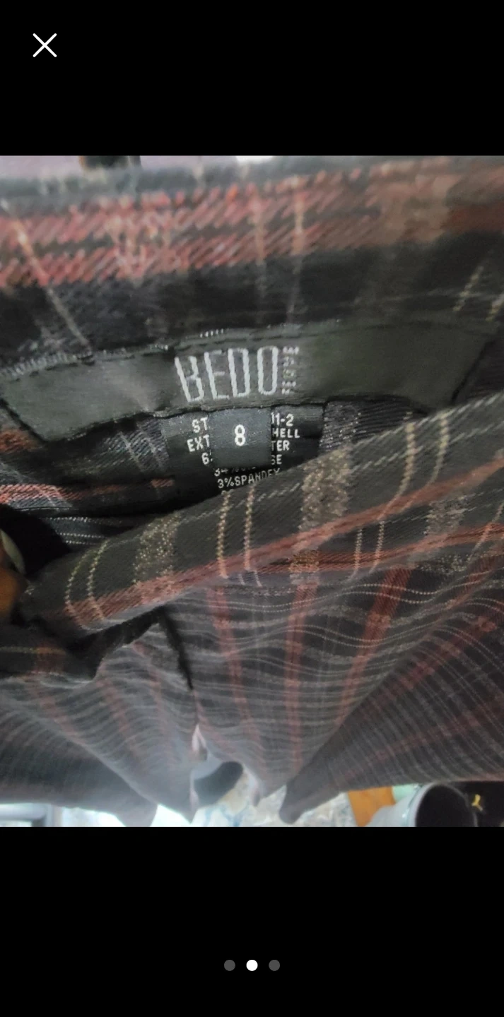 These BEDO pants feature a stylish plaid pattern in shades of red, black, and grey. They are a size 8 and made with a blend of polyester and spandex for a comfortable fit. Perfect for adding a touch of sophistication to your wardrobe!
