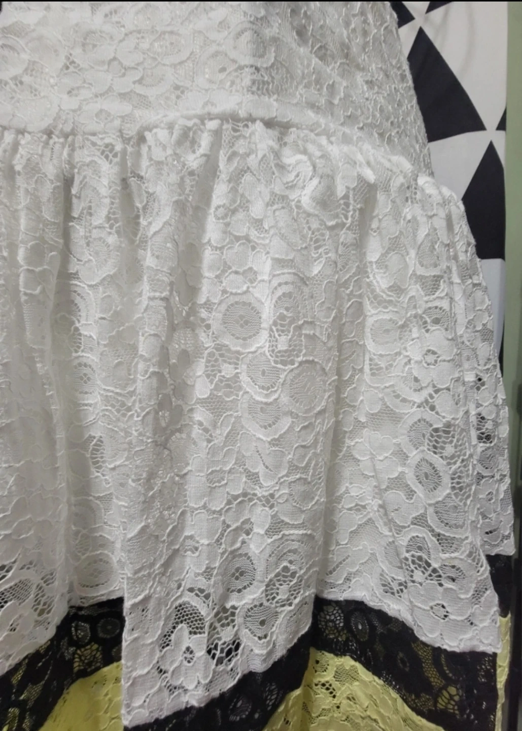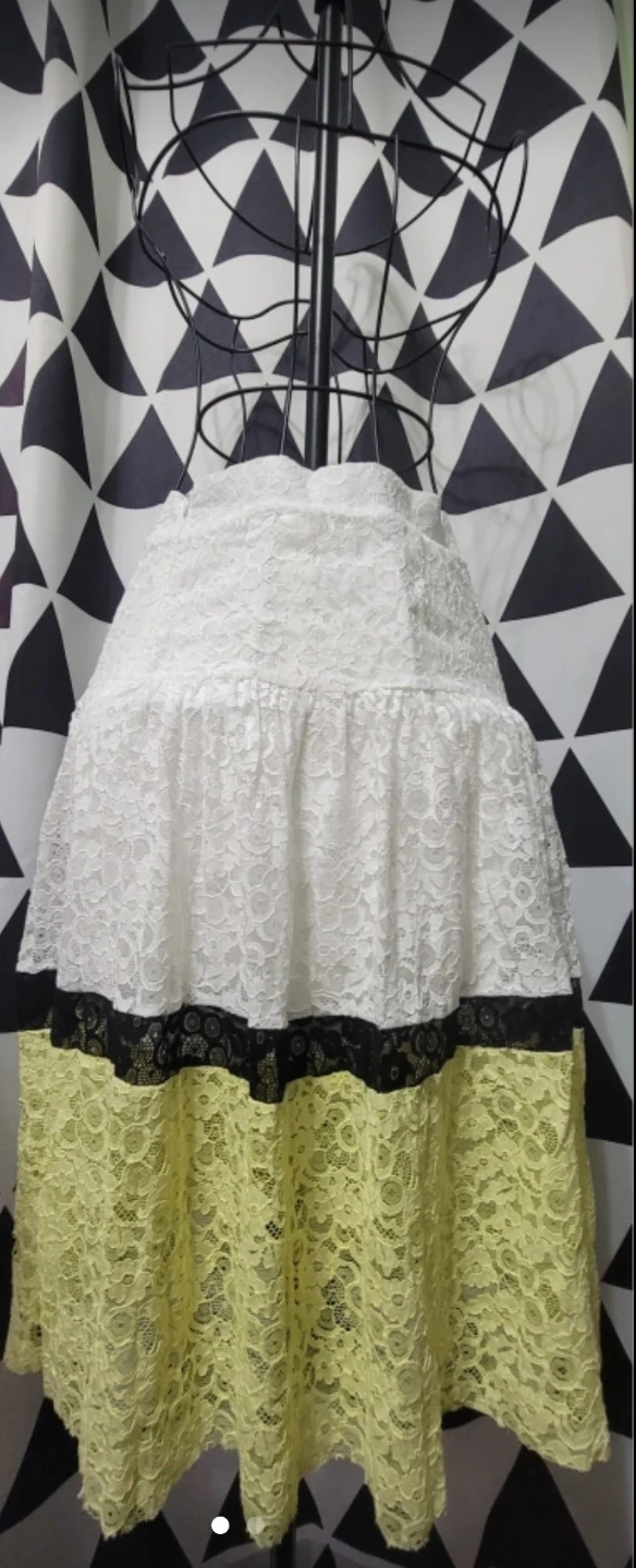 Here's a lovely lace skirt in white, black, and yellow. It's in great condition and ready for a new wardrobe!
