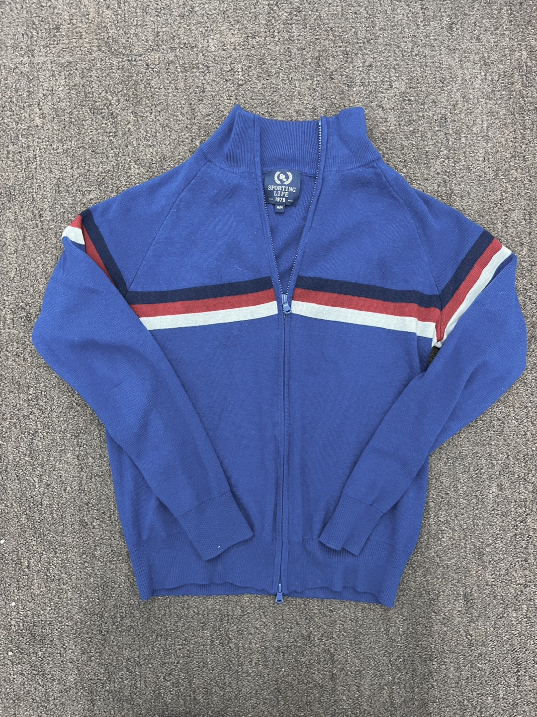 Selling a Sporting Life full zip sweater. It's blue with red and white stripes across the chest and arms.
