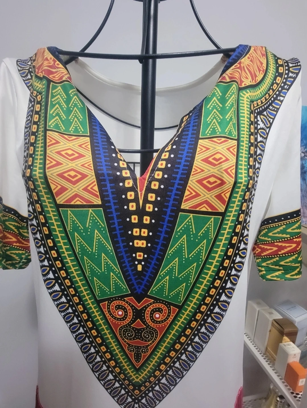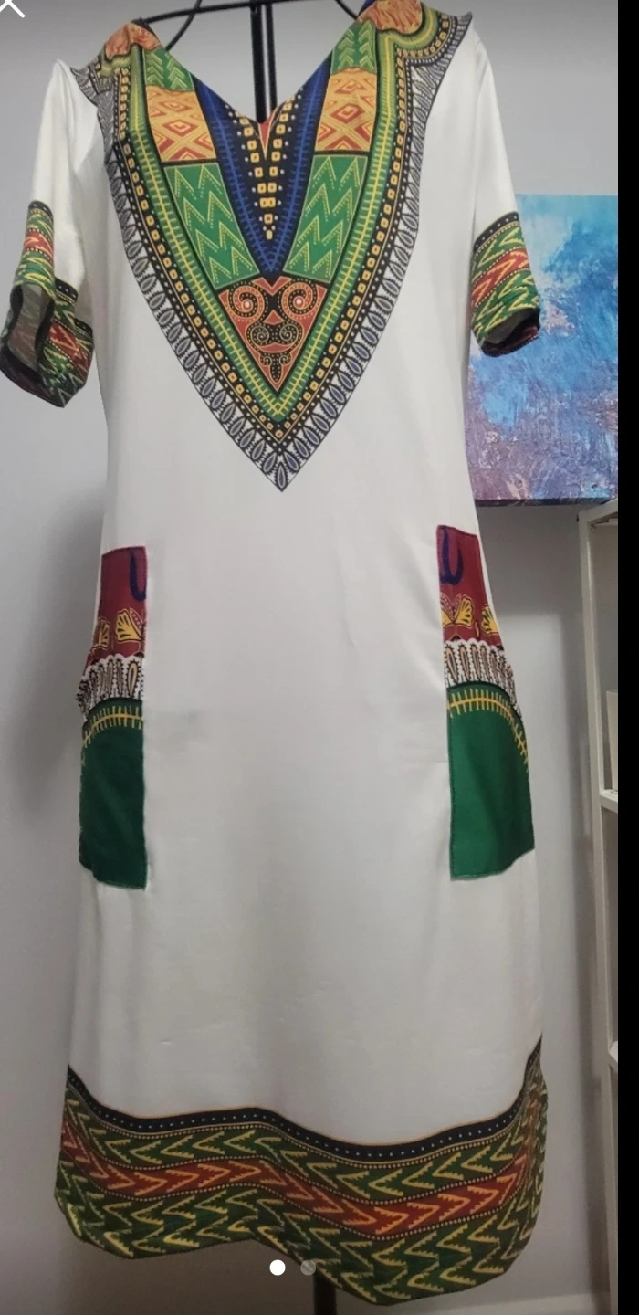 Selling a vibrant white dress with a colourful African print design. It's in great condition and features a unique pattern around the neckline, sleeves, and hem. Perfect for adding a pop of colour to your wardrobe!