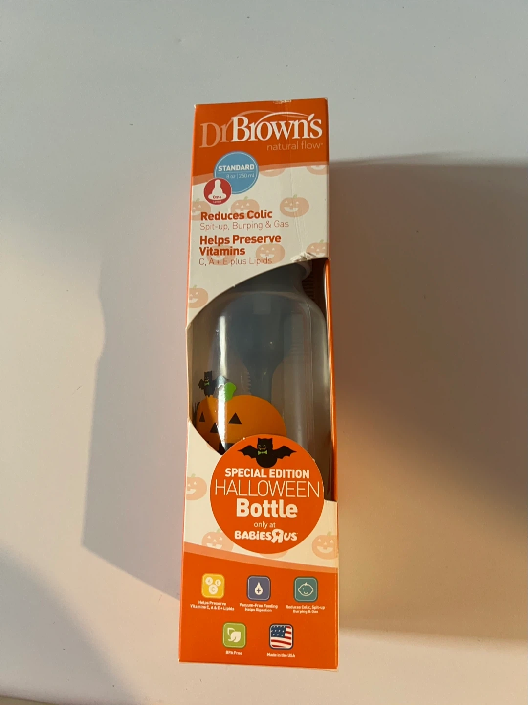 I'm selling a special edition Halloween bottle from Dr. Brown's! It's designed to reduce colic, spit-up, and gas. It also helps to preserve Vitamins C, A, and E, plus Lipids. This bottle is BPA-Free and Made in the USA. It's a standard 8 oz / 250 ml size.
