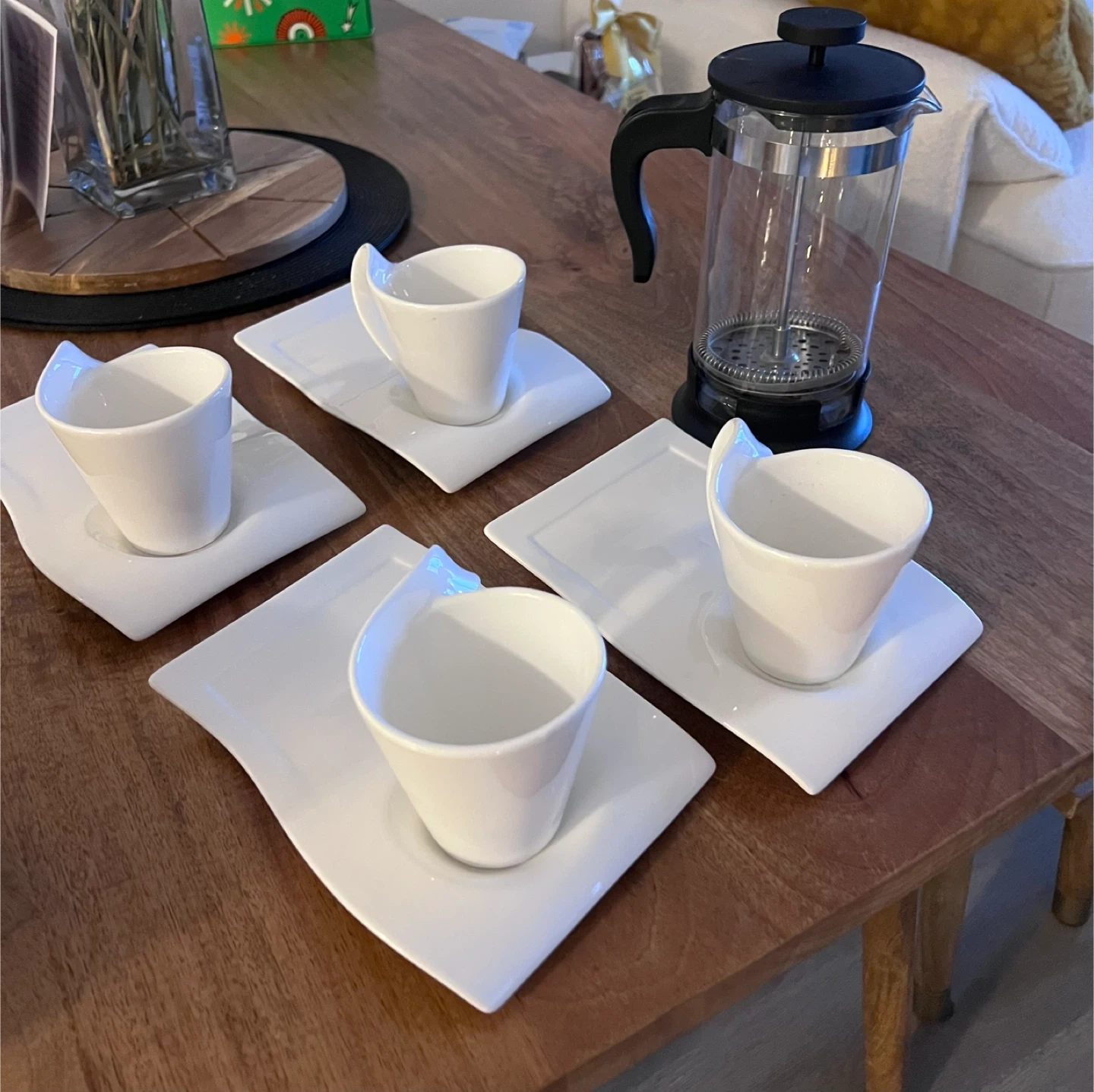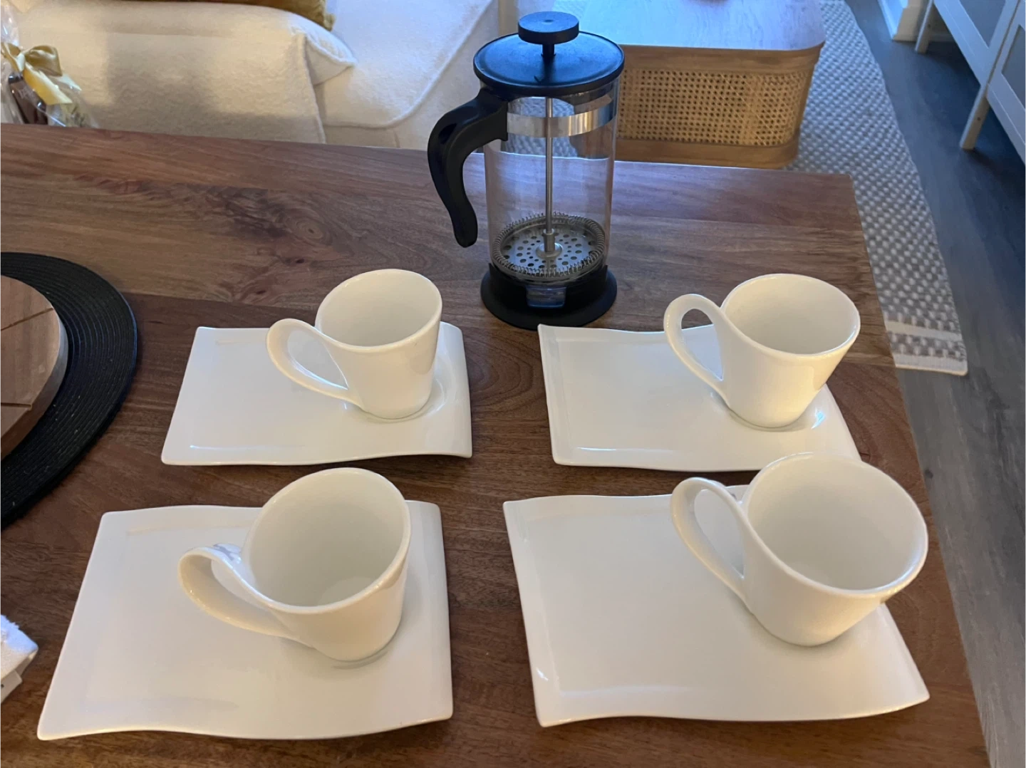 Selling a set of four white coffee cups and saucers, perfect for enjoying your morning brew! Also included is a French press for making delicious coffee. They are in great condition and ready for a new home!