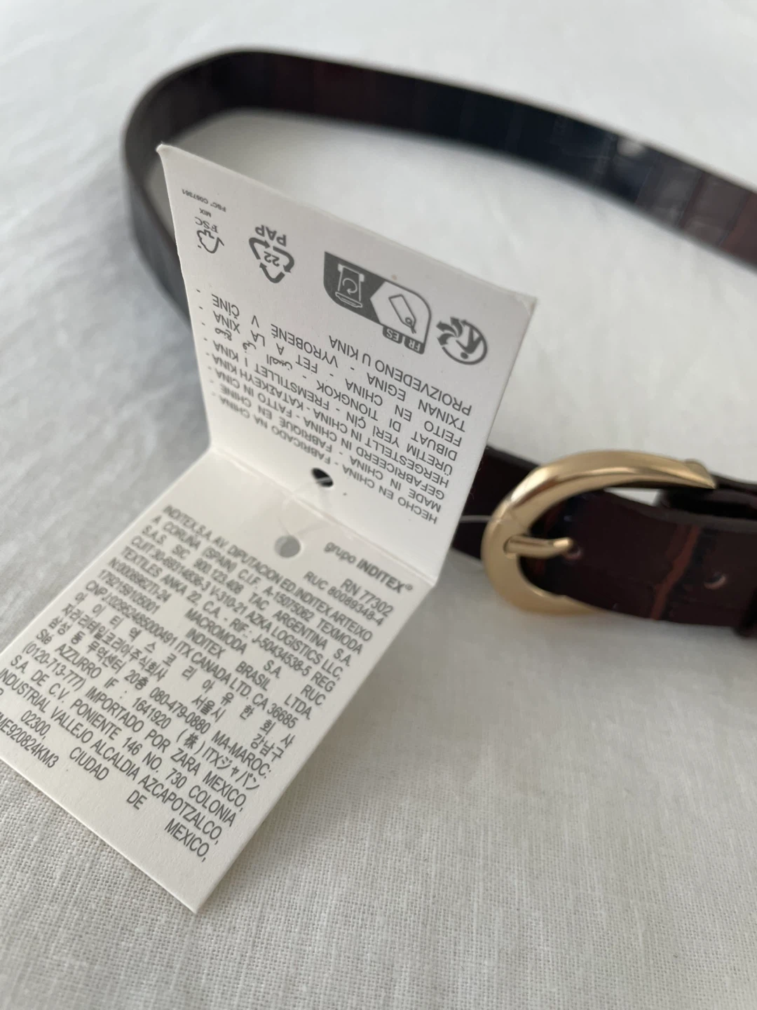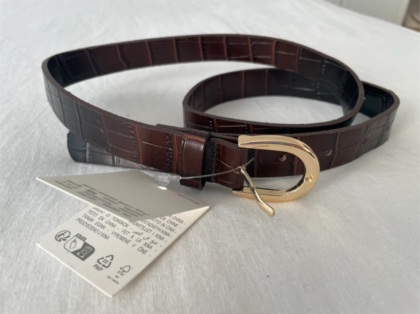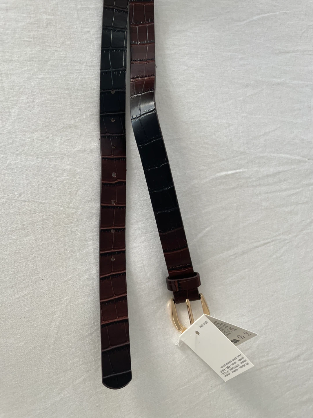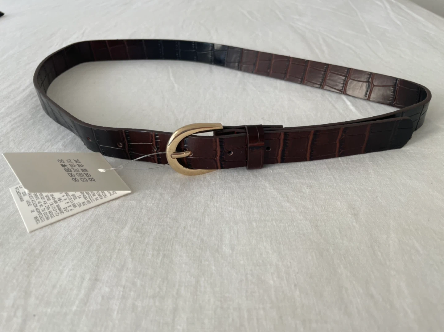 Selling a stylish Zara belt in a brown crocodile embossed pattern. It's a size 40, measuring approximately 40 inches in length. The belt features a gold-toned buckle, adding a touch of elegance to any outfit