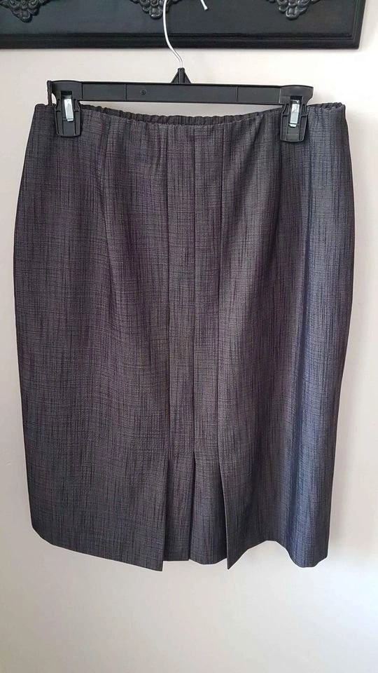 Women's Size 12 Gray Straight Skirt. Fully lined. Side zip and button closure. Elastic in waist for a bit of stretch. Three kick pleats on back. 24" long. Polyester/rayon/spandex blend. Machine wash and dry. Has been washed. Smoke/pet free home. Pick up west end of Peterborough near Glenforest. $5