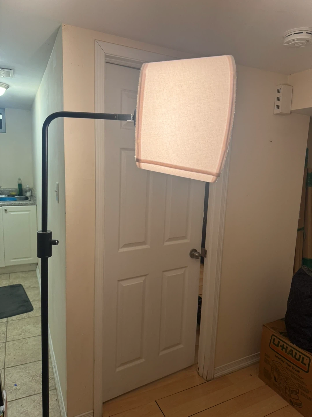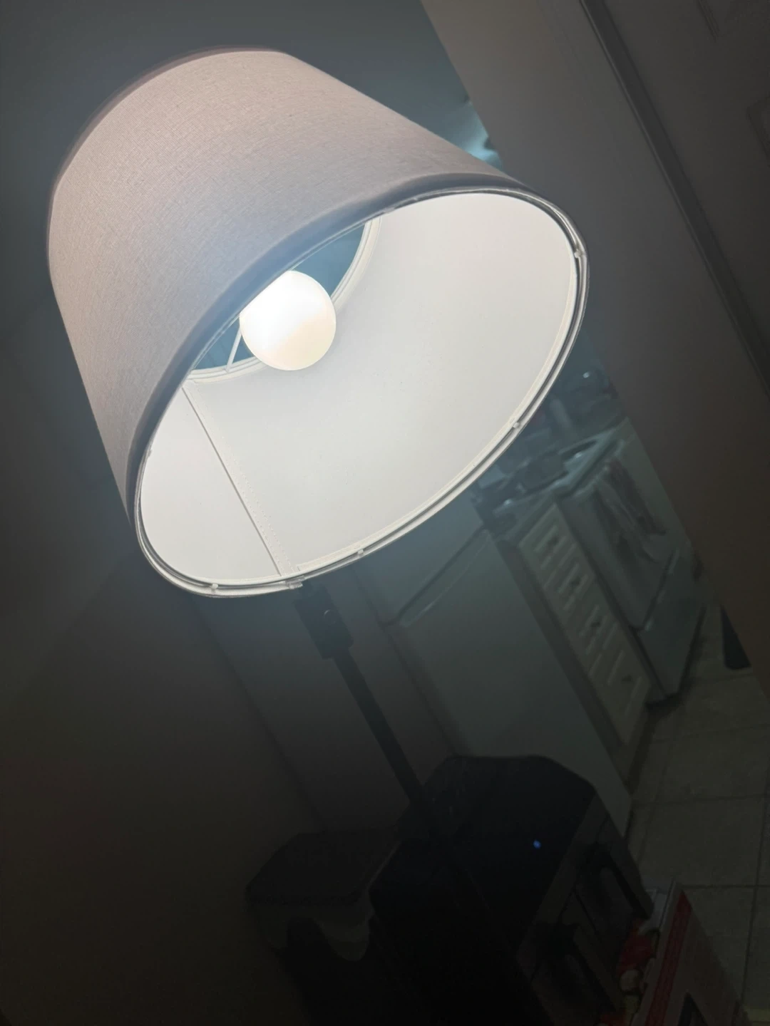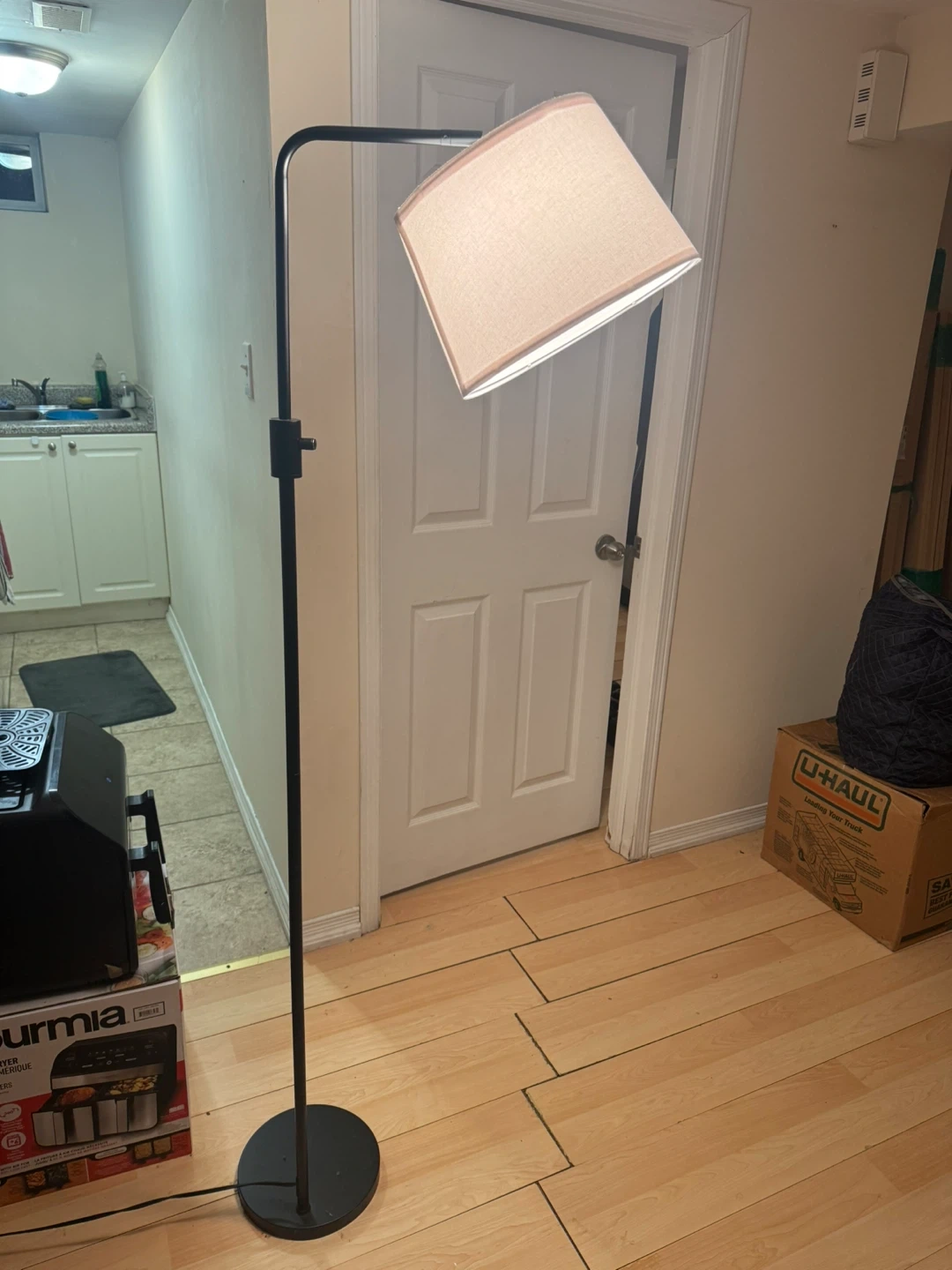 Here's a floor lamp with a beige shade. It's in great condition and ready to brighten up any room! It has a black metal frame and a neutral-toned shade, so it will fit in with most decor styles. Delivery included.