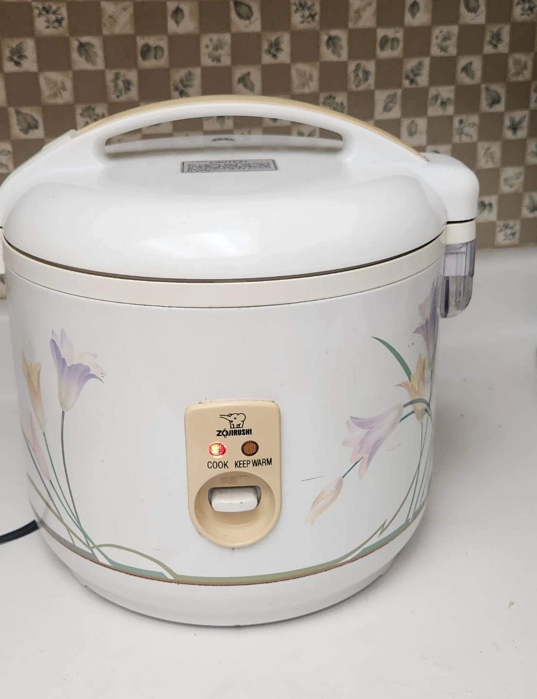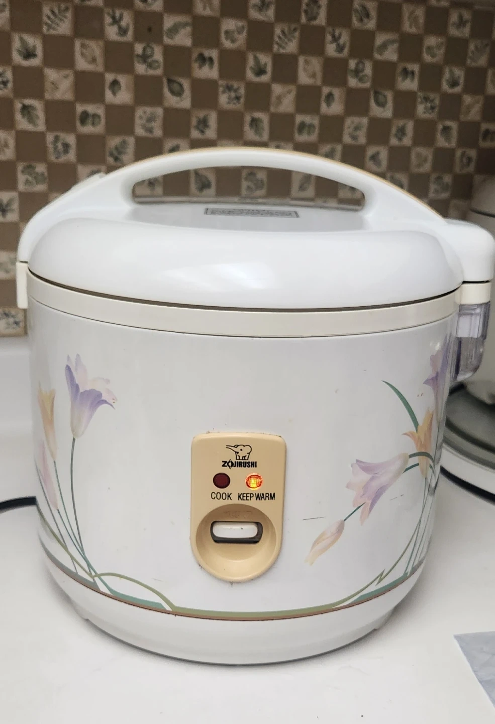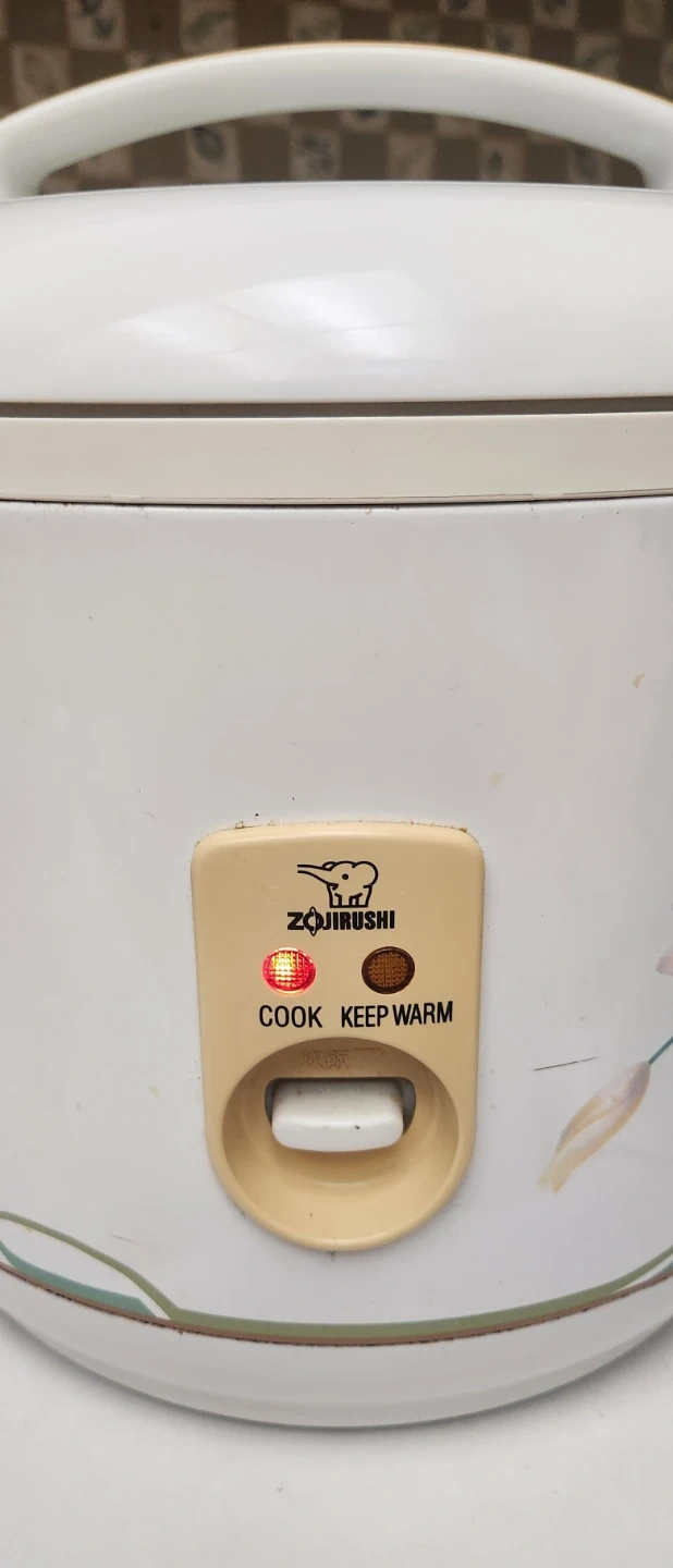 Selling a Zojirushi rice cooker. It has a cook and keep warm function. It has a floral design on the outside.