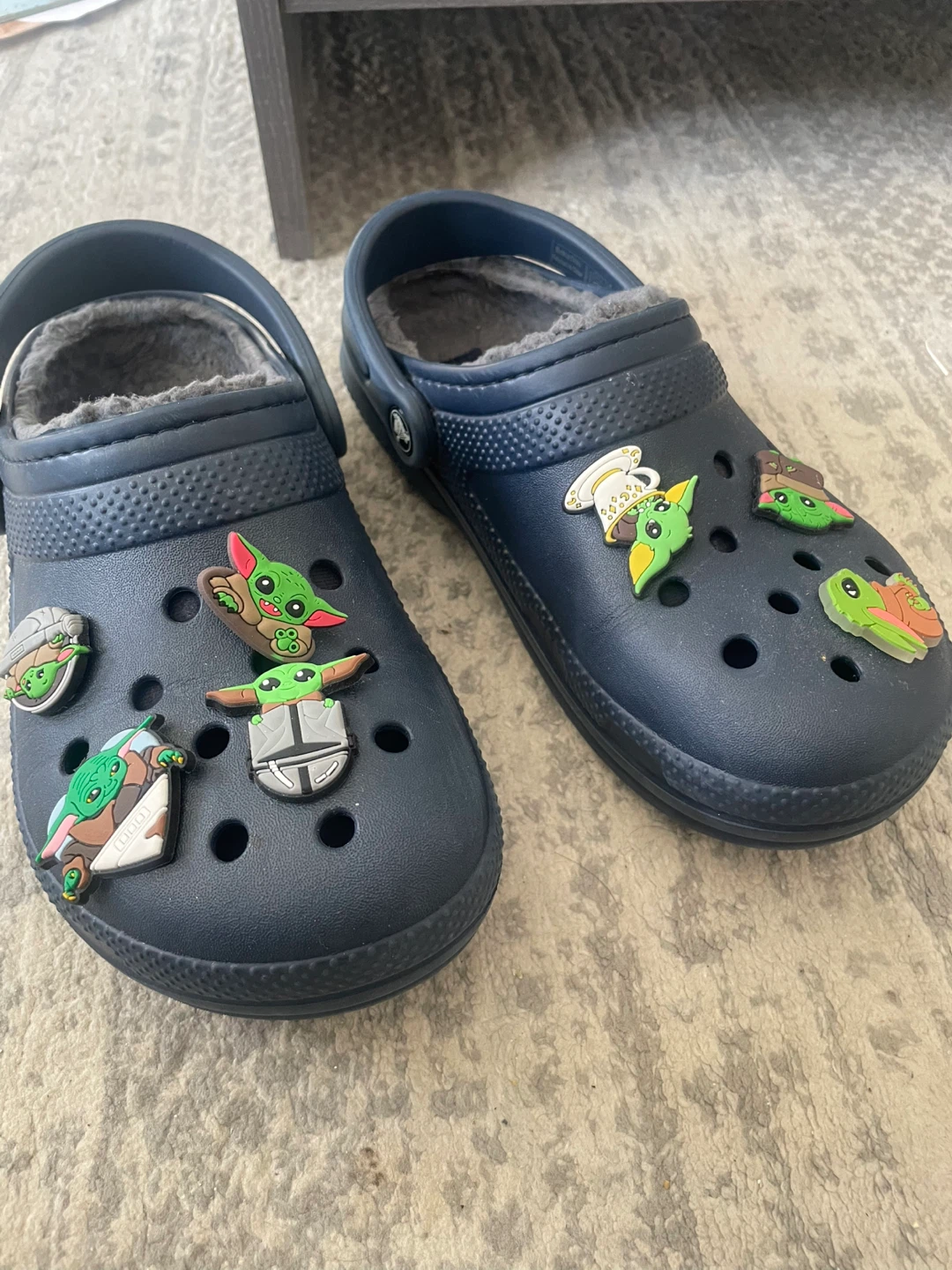 Cozy lined Crocs clogs in a nice navy colour! They have some fun charms attached. Great for keeping your feet warm and comfy