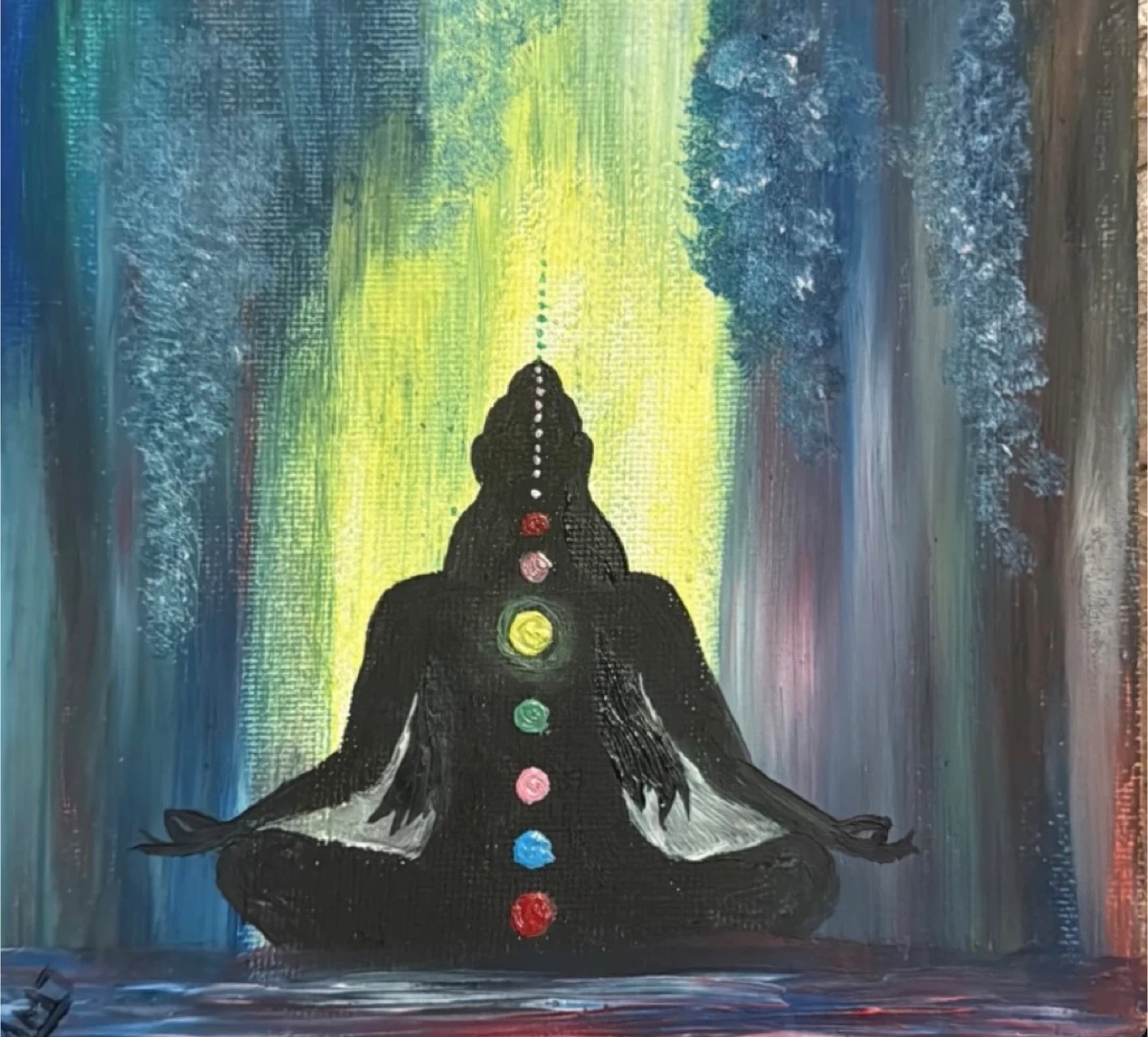 This is a painting of a person meditating with the chakras aligned. It would look great in any room! It brings positive vibes and makes your day good