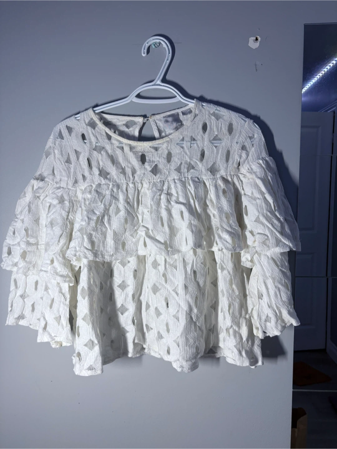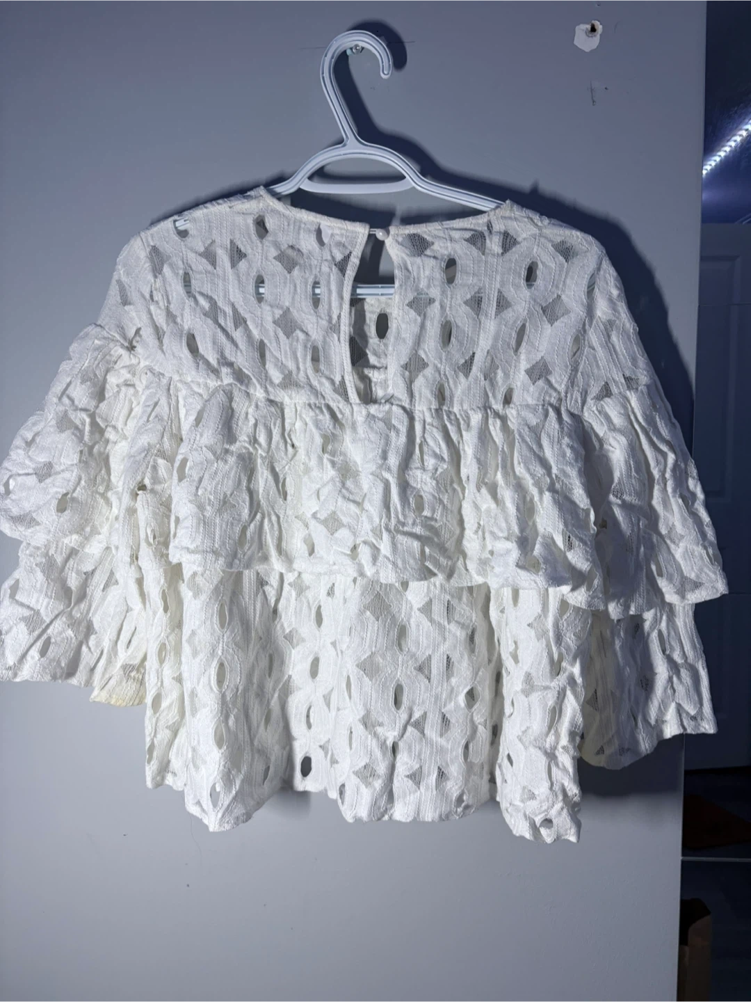 Buy & SellWhite Ruffled Lace Blouse size LWhite Ruffled Lace Blouse size L$5Selling a cute white blouse with ruffled detailing! It's a lightweight, flowy material. Perfect for summer!ConditionOkayWHERE TO MEETCheck LocationView MapSELLERverifiedZeeAinslie Wood West600 reviews0 chats·0 favorites·14 viewsSEND CHAT TO SELLERHi Zee! I’m interested in your listing.Hi Zee! I’m interested in your listing.Get the Karrot app to chatSign In to chat