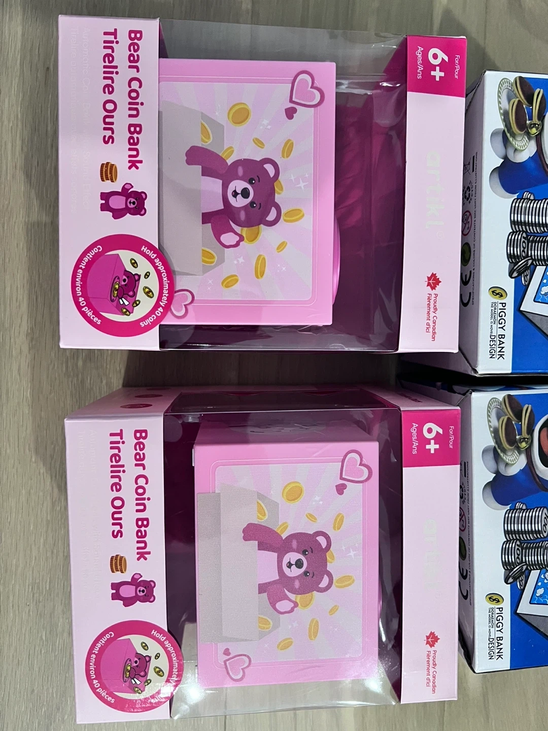 I have a new Bear Coin Bank and Doraemon Saving Pot available! They are both in their original packaging and ready to help your little ones save their coins. The Bear Coin Bank is pink and features a cute bear design, and the Doraemon Saving Pot features the popular character Doraemon