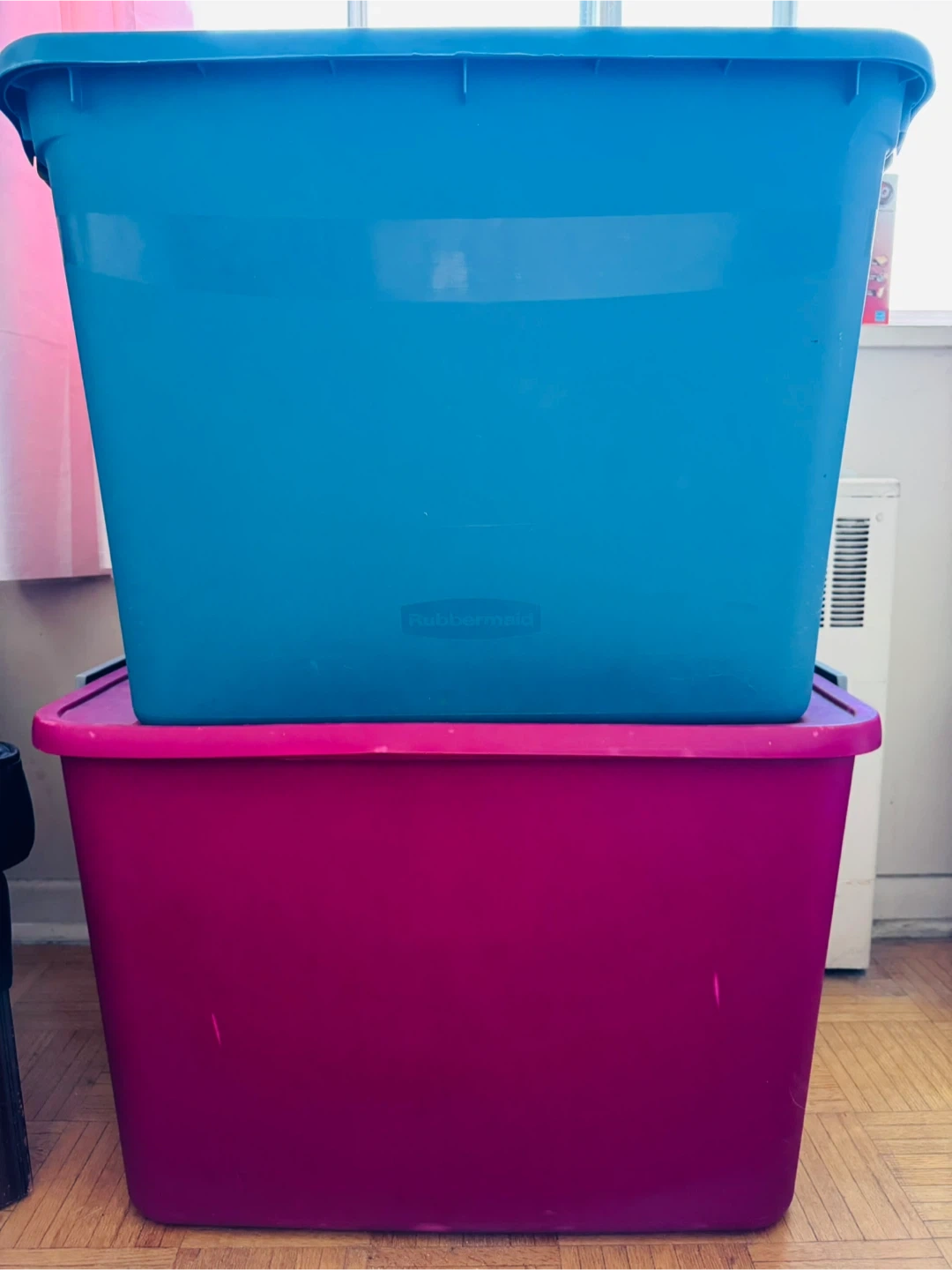 Two Rubbermaid storage totes for sale! One is a nice bright blue and the other is a vibrant pink. They're great for organizing and storing your belongings