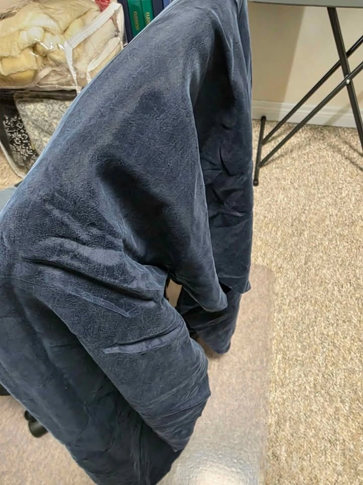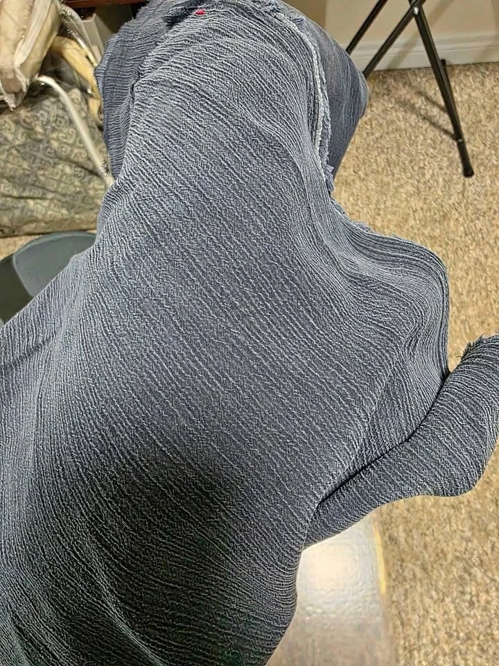 Two Pieces Dark Blue Fabric. Light weight. Grey blue piece -poly blend. Has a textured look to it. 1.4 meters, 60" wide. Indigo piece feels like a soft rayon with a brushed finish