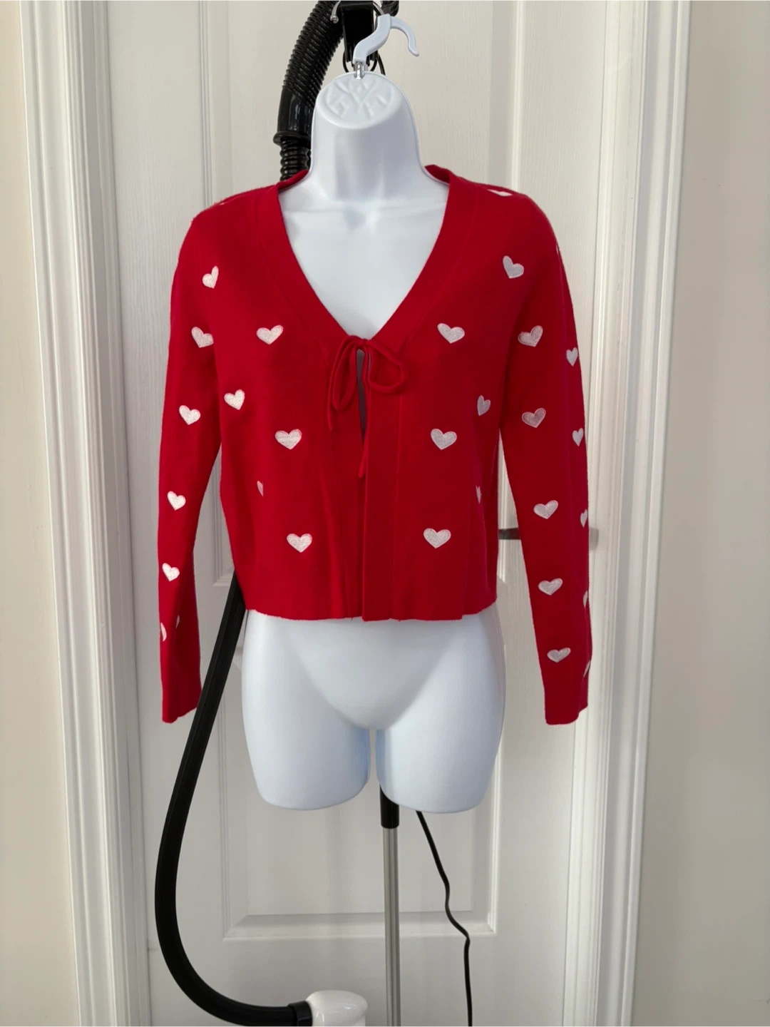 Cute red cardigan with white heart pattern! It's a size XS and in great condition. Perfect for adding a pop of colour to your wardrobe!