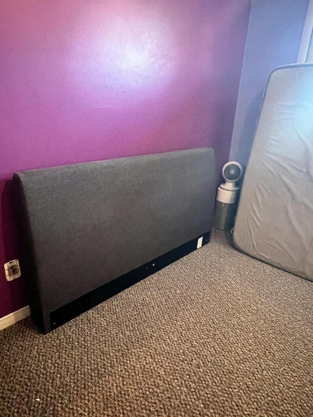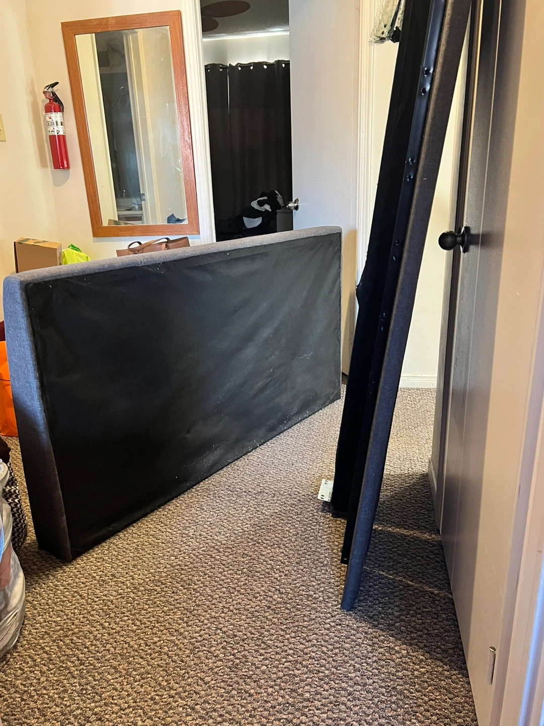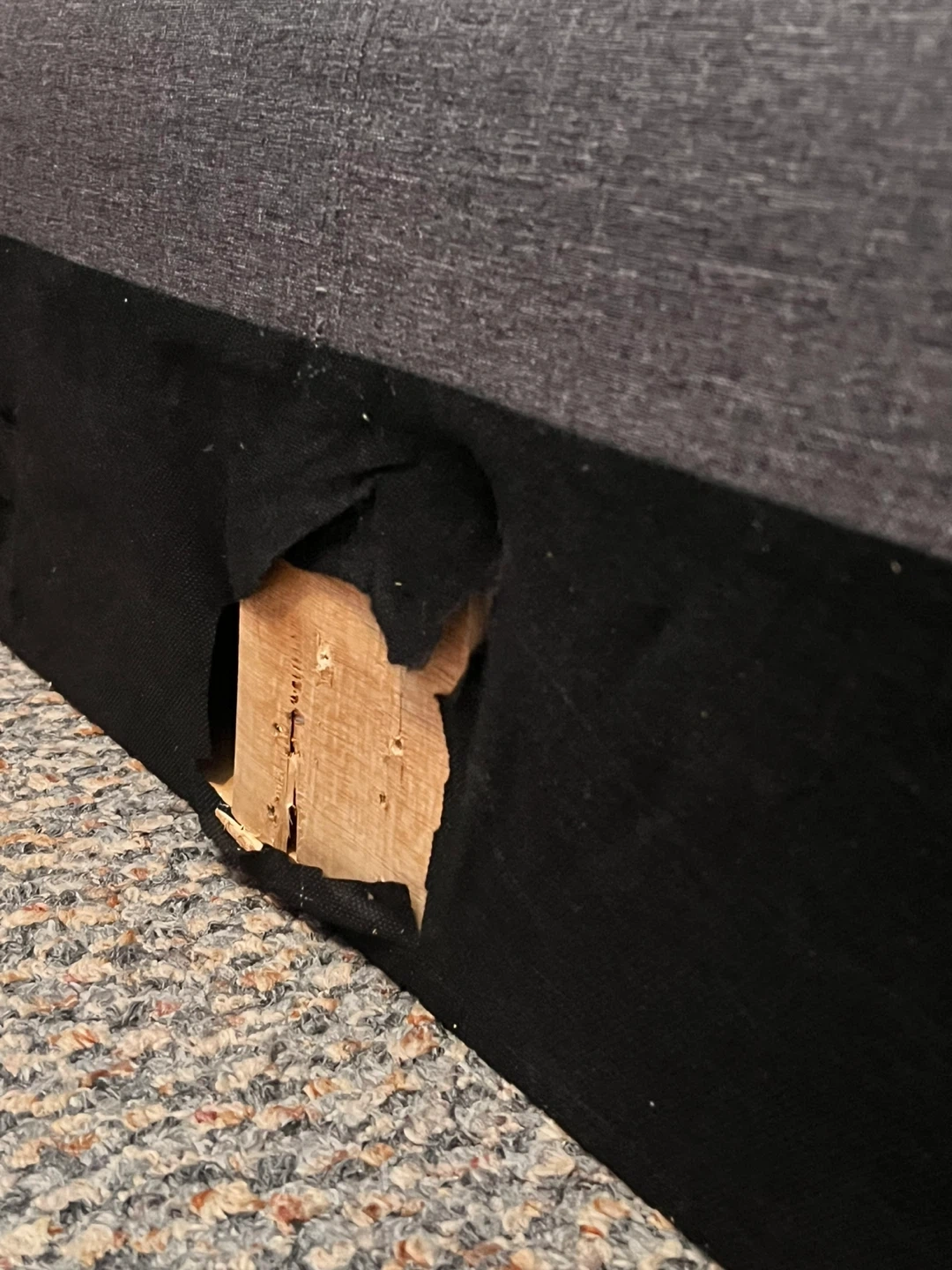 Selling a used upholstered bed frame in grey. It's in decent condition, but does have some damage to the fabric on one side. Please see the photos for details!