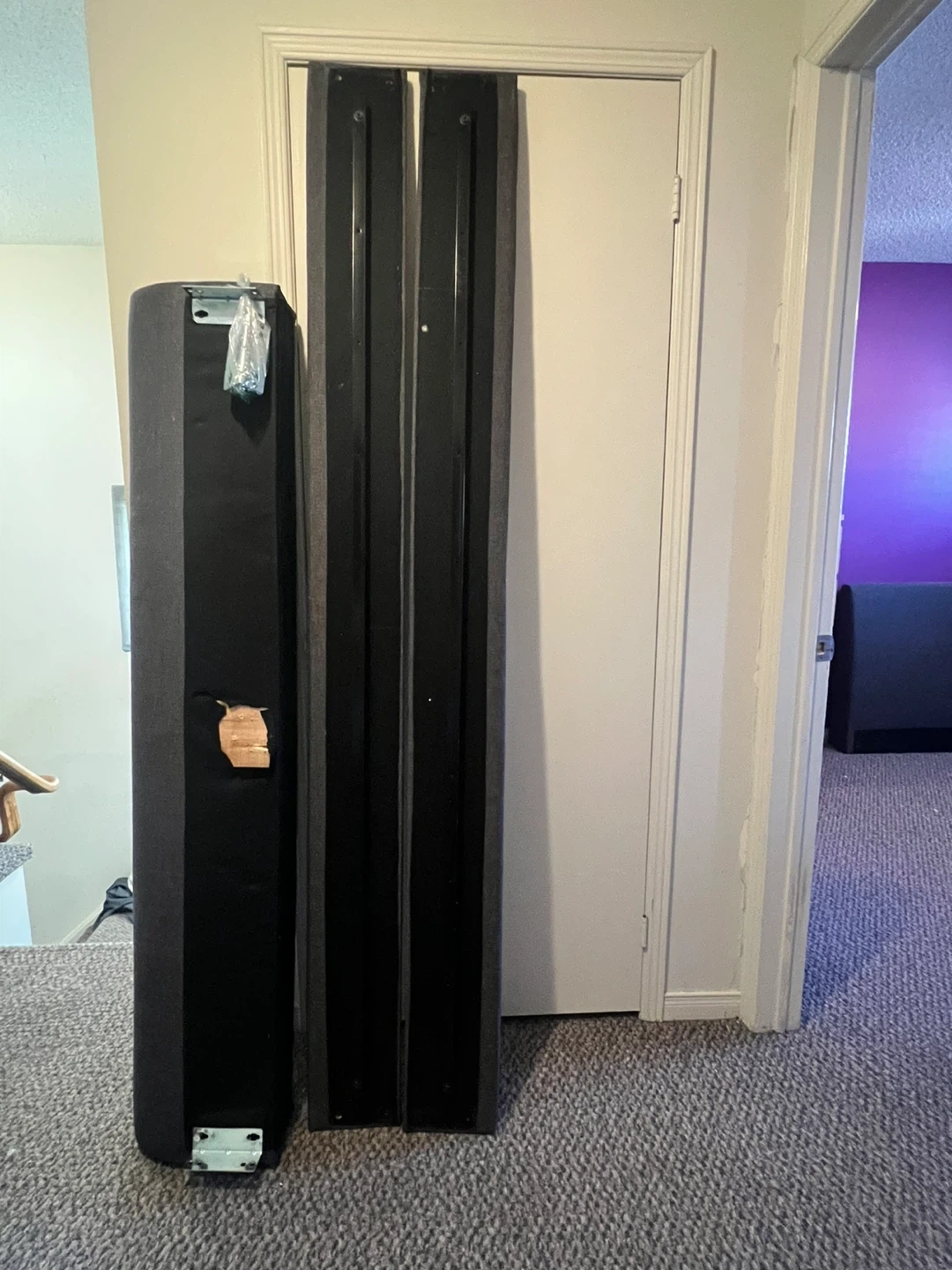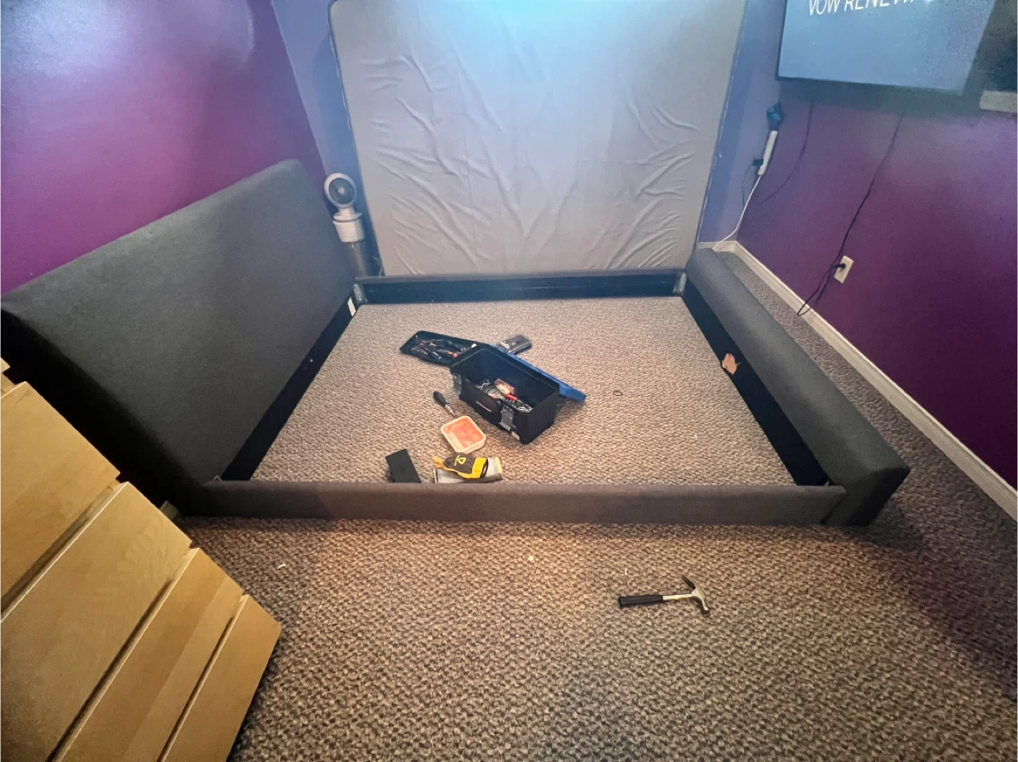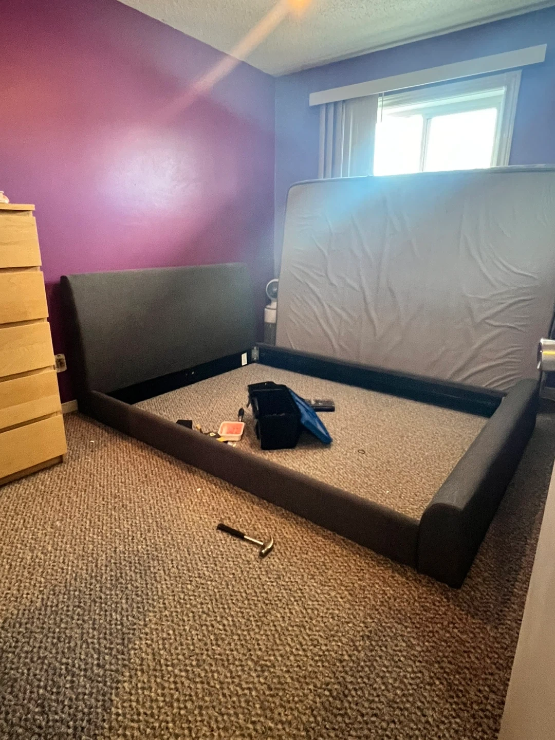 Selling a used upholstered bed frame in grey. It's in decent condition, but does have some damage to the fabric on one side. Please see the photos for details!