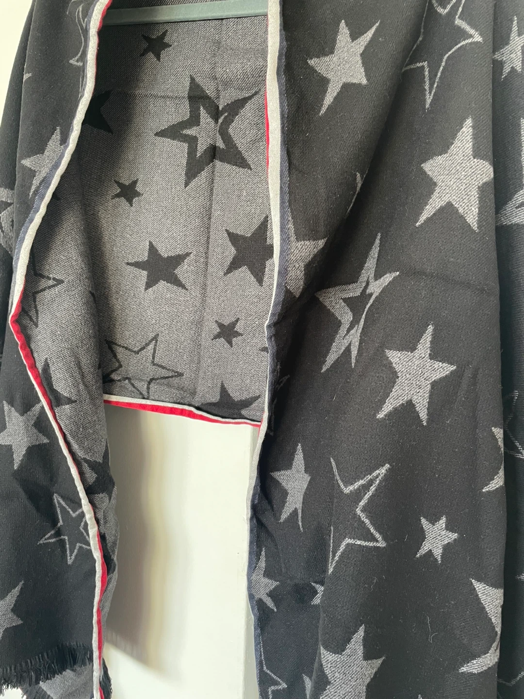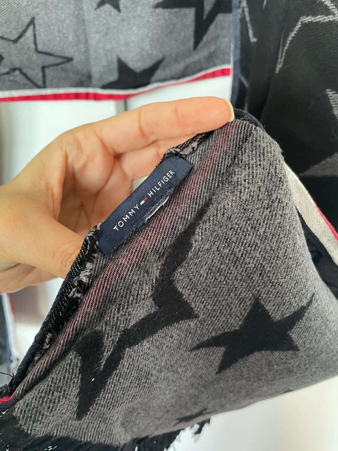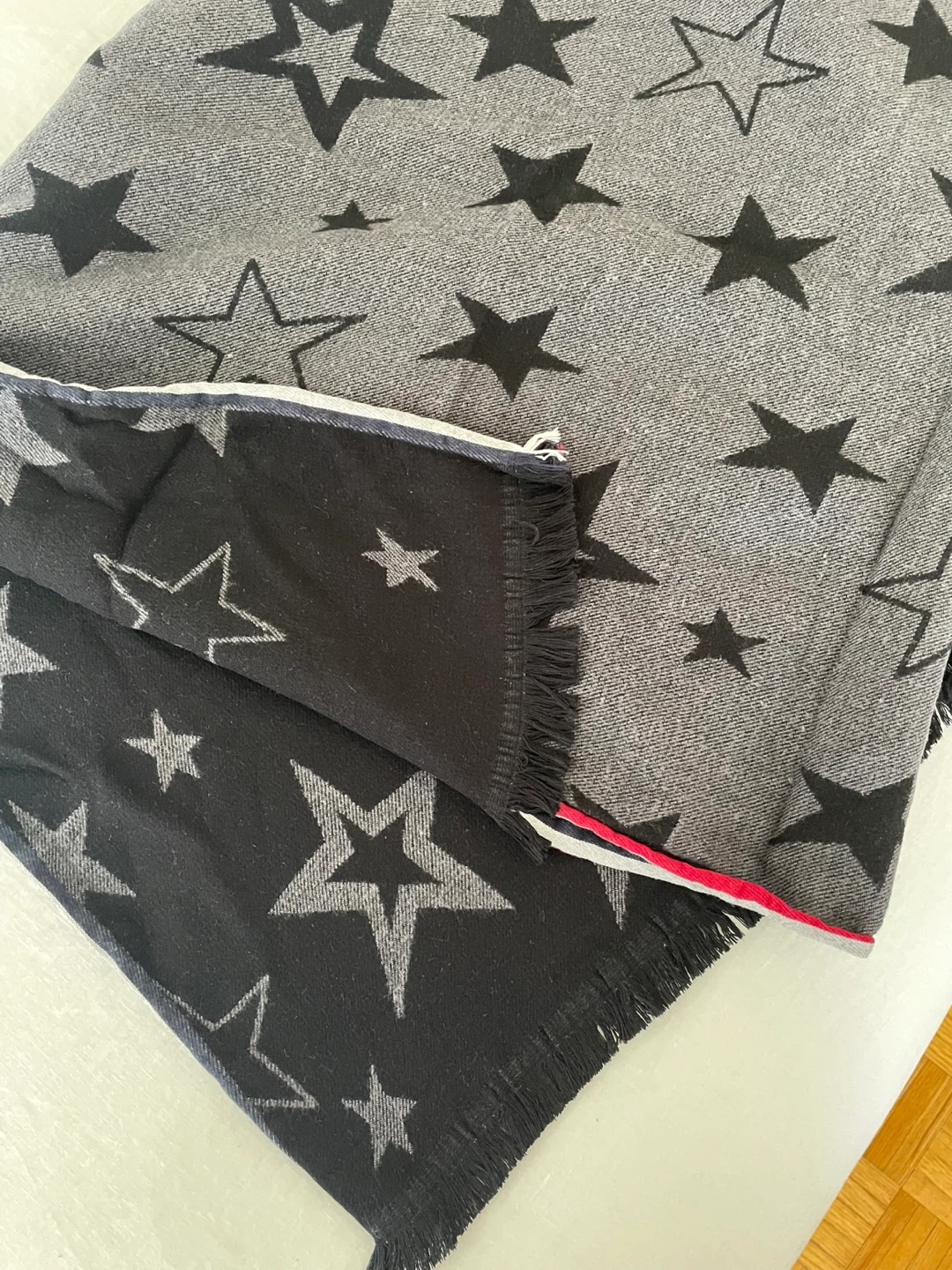 Snuggle up in this stylish Tommy Hilfiger scarf! It features a cool star print design in versatile black and grey tones. Perfect for adding a touch of flair to any outfit!