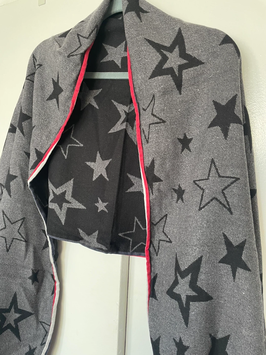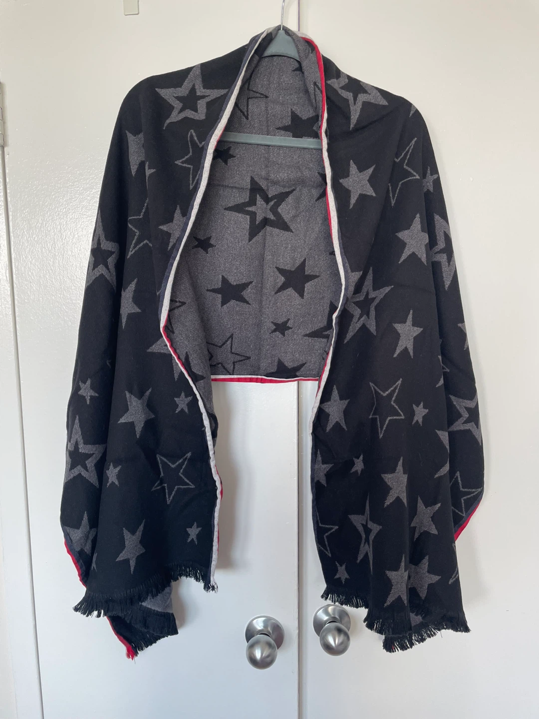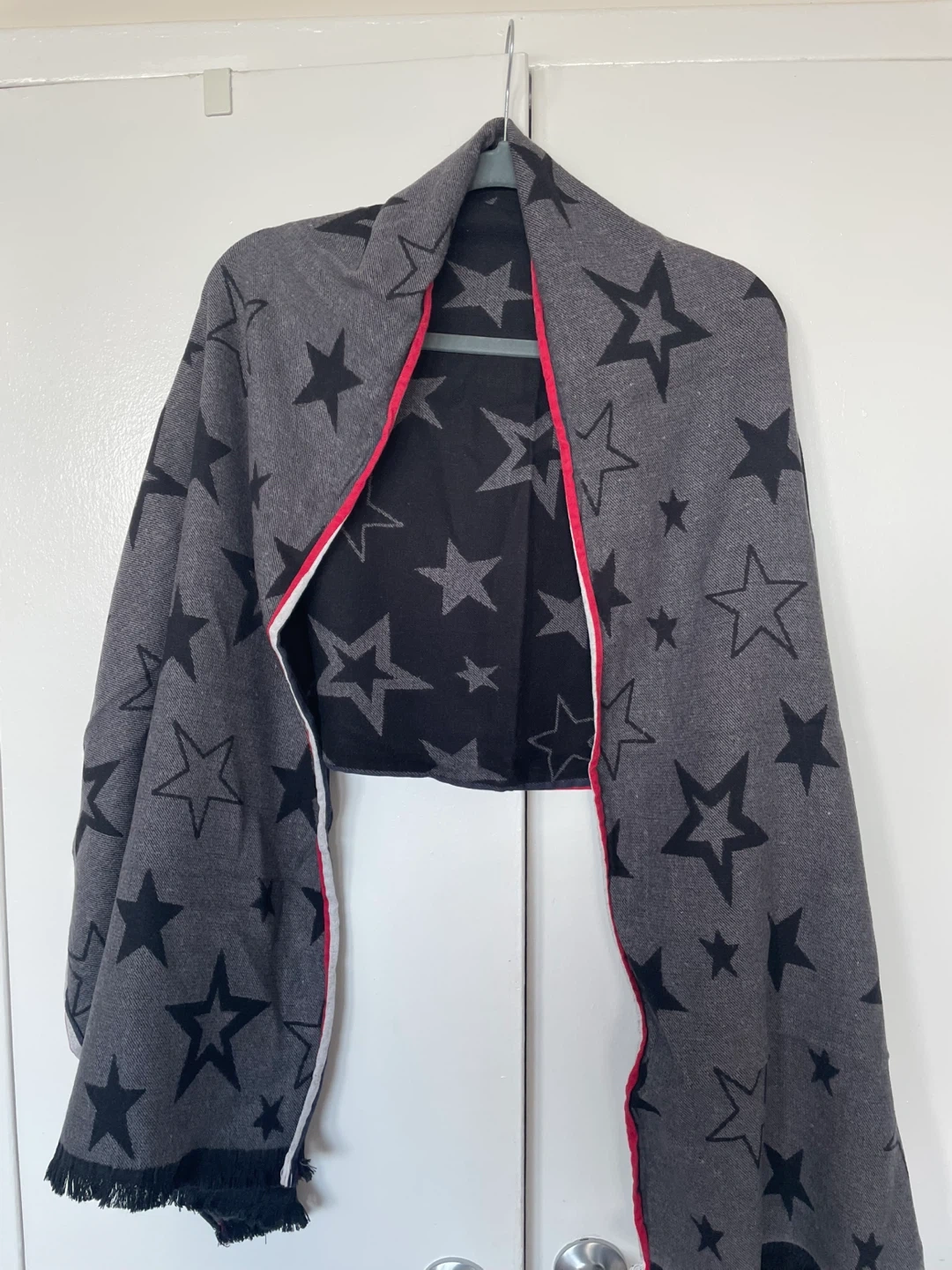 Snuggle up in this stylish Tommy Hilfiger scarf! It features a cool star print design in versatile black and grey tones. Perfect for adding a touch of flair to any outfit!