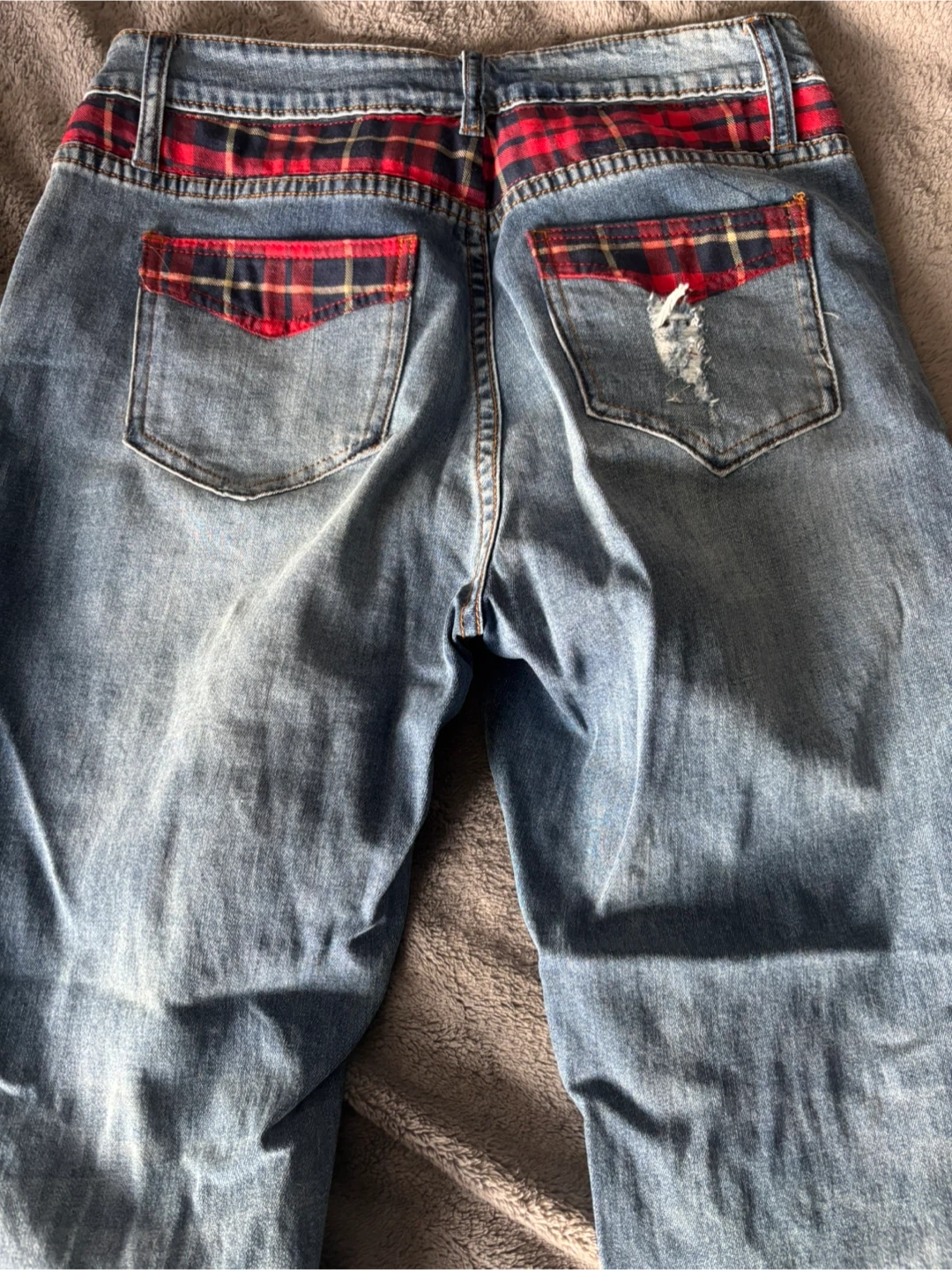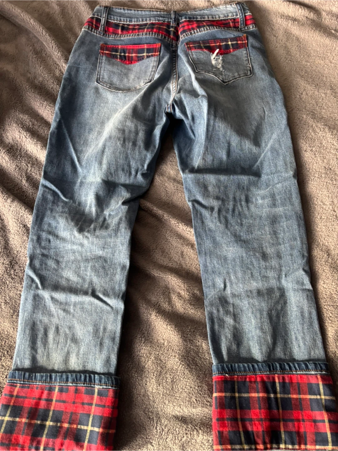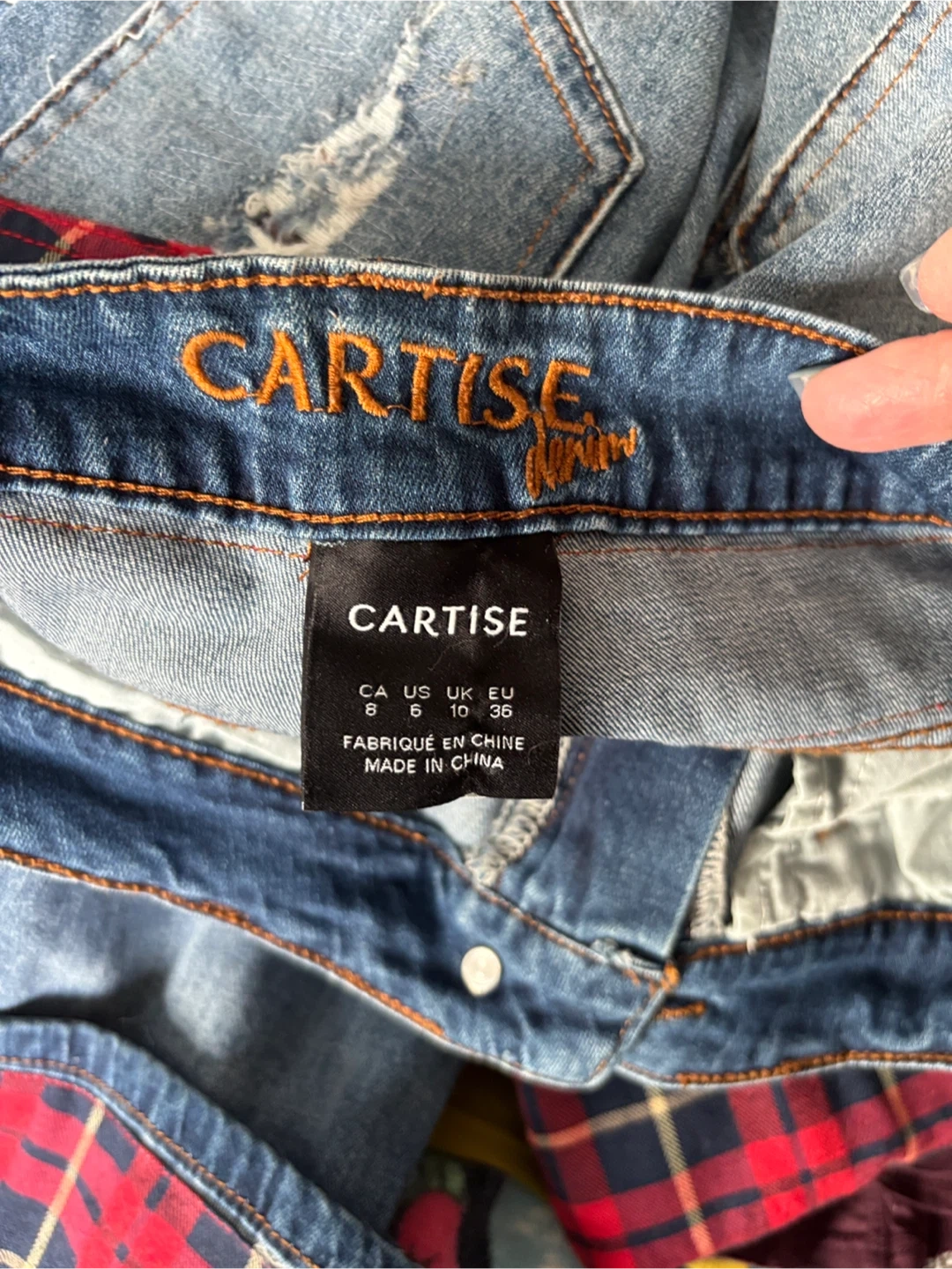 Cartise cropped cuffed denim jeans in size 8. They have a unique distressed look with red and blue plaid accents. The jeans are in good condition and ready for a new home!