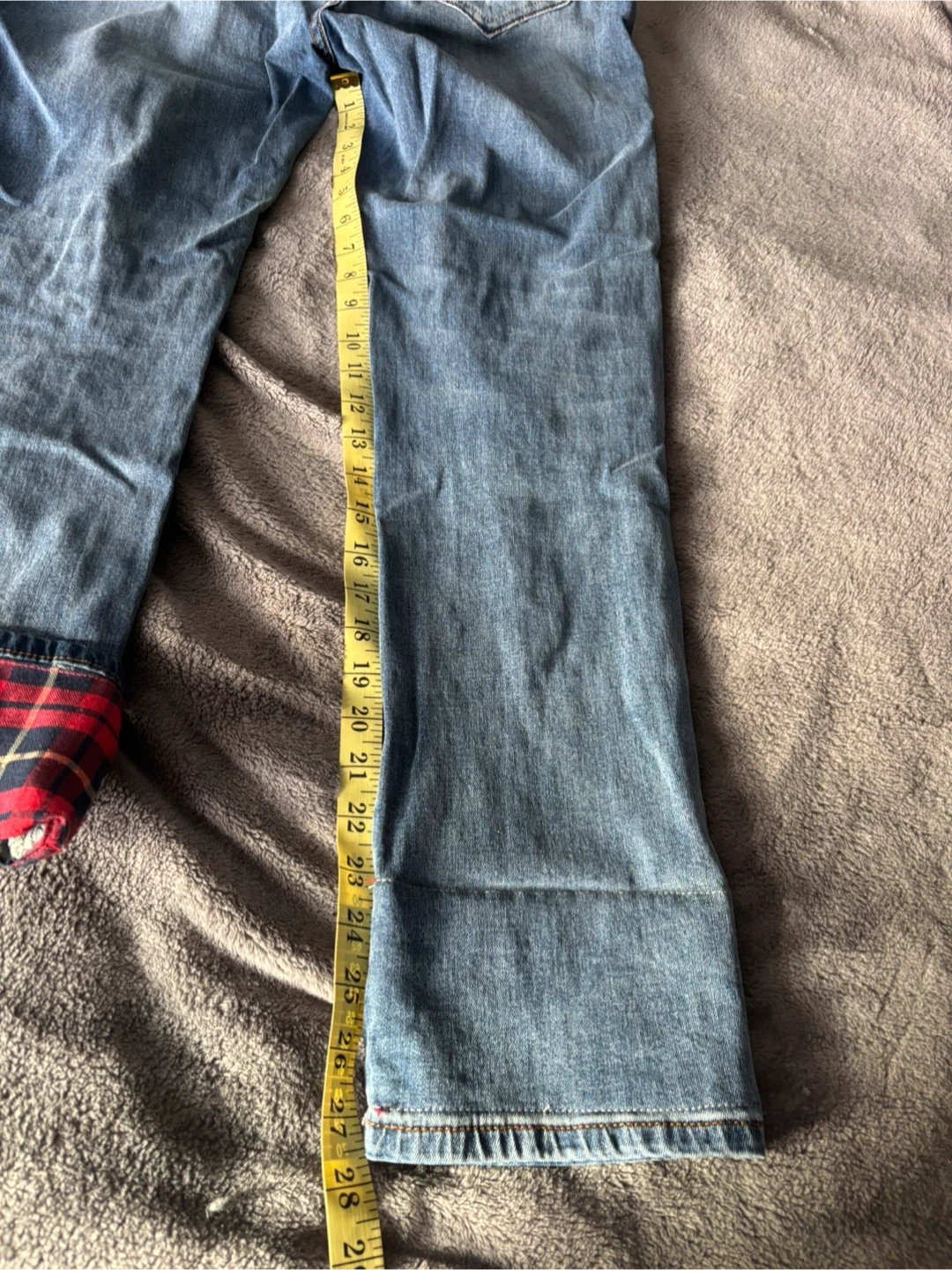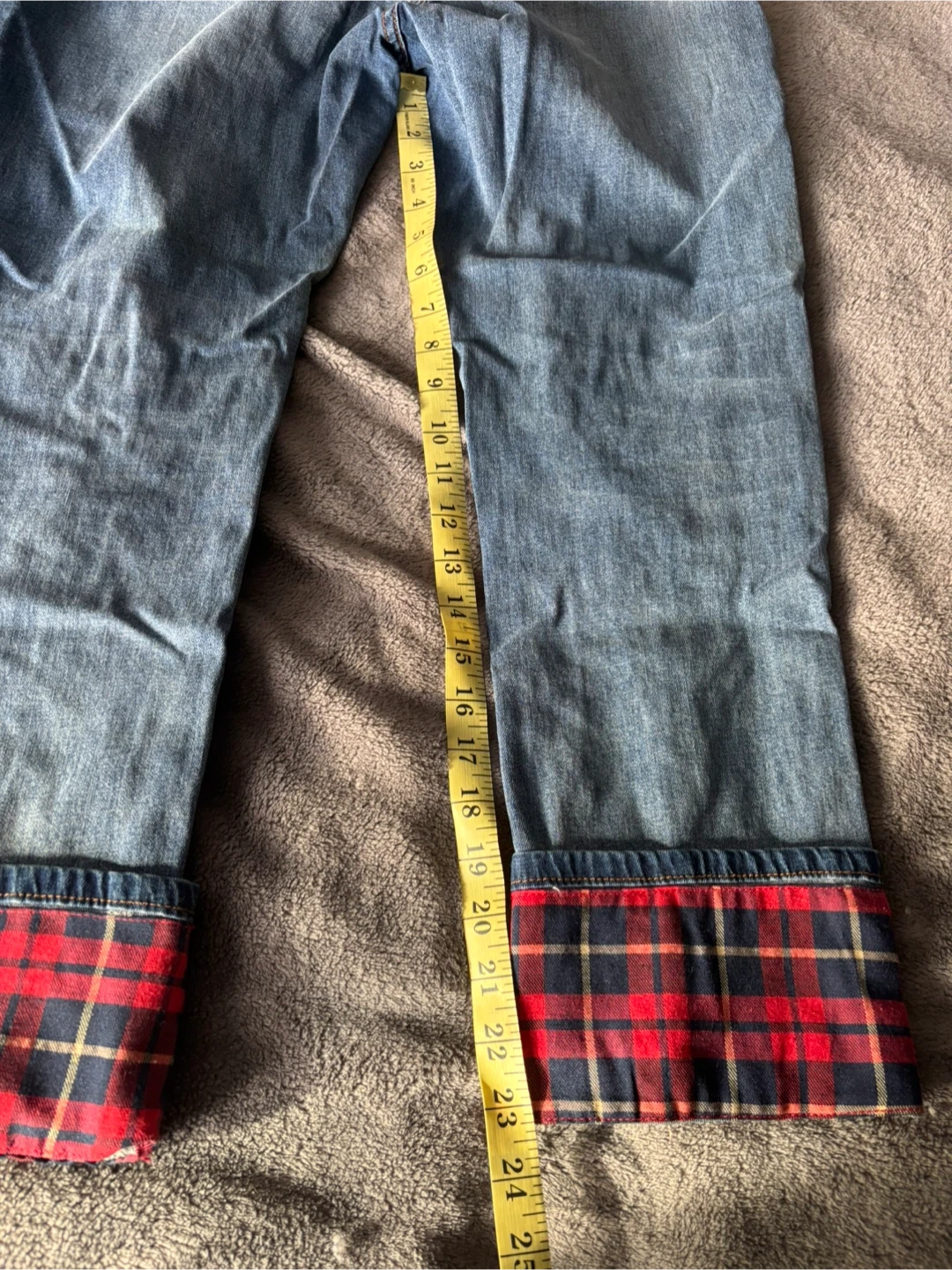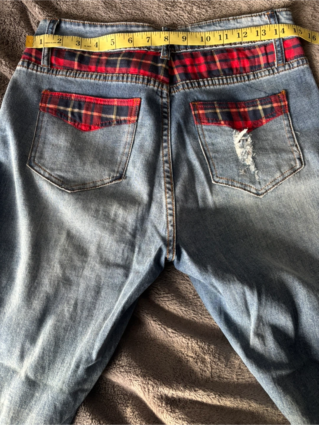 Cartise cropped cuffed denim jeans in size 8. They have a unique distressed look with red and blue plaid accents. The jeans are in good condition and ready for a new home!