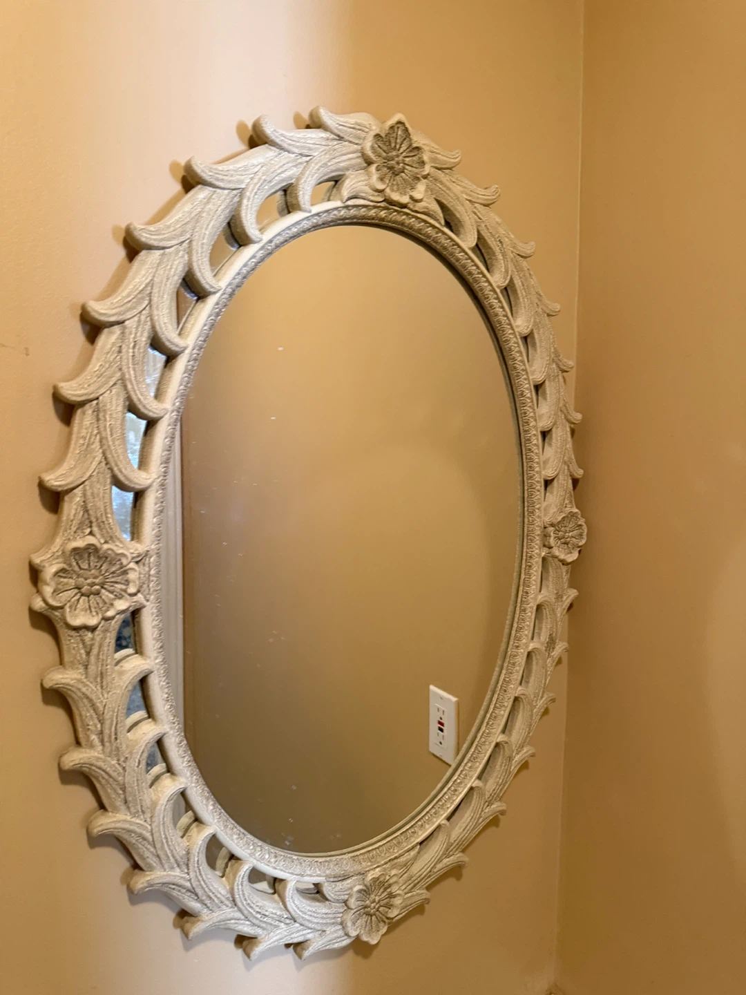 Selling a lovely oval decorative wall mirror. It has a beautiful floral design around the frame. It's in great condition and would add a touch of elegance to any room