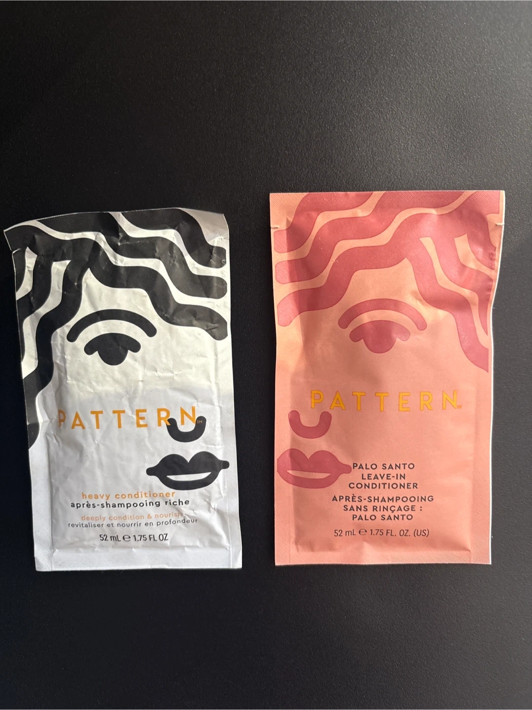 Selling two Pattern conditioner samples! One is the heavy conditioner and the other is the Palo Santo leave-in conditioner. Each packet contains 52 mL / 1.75 FL OZ