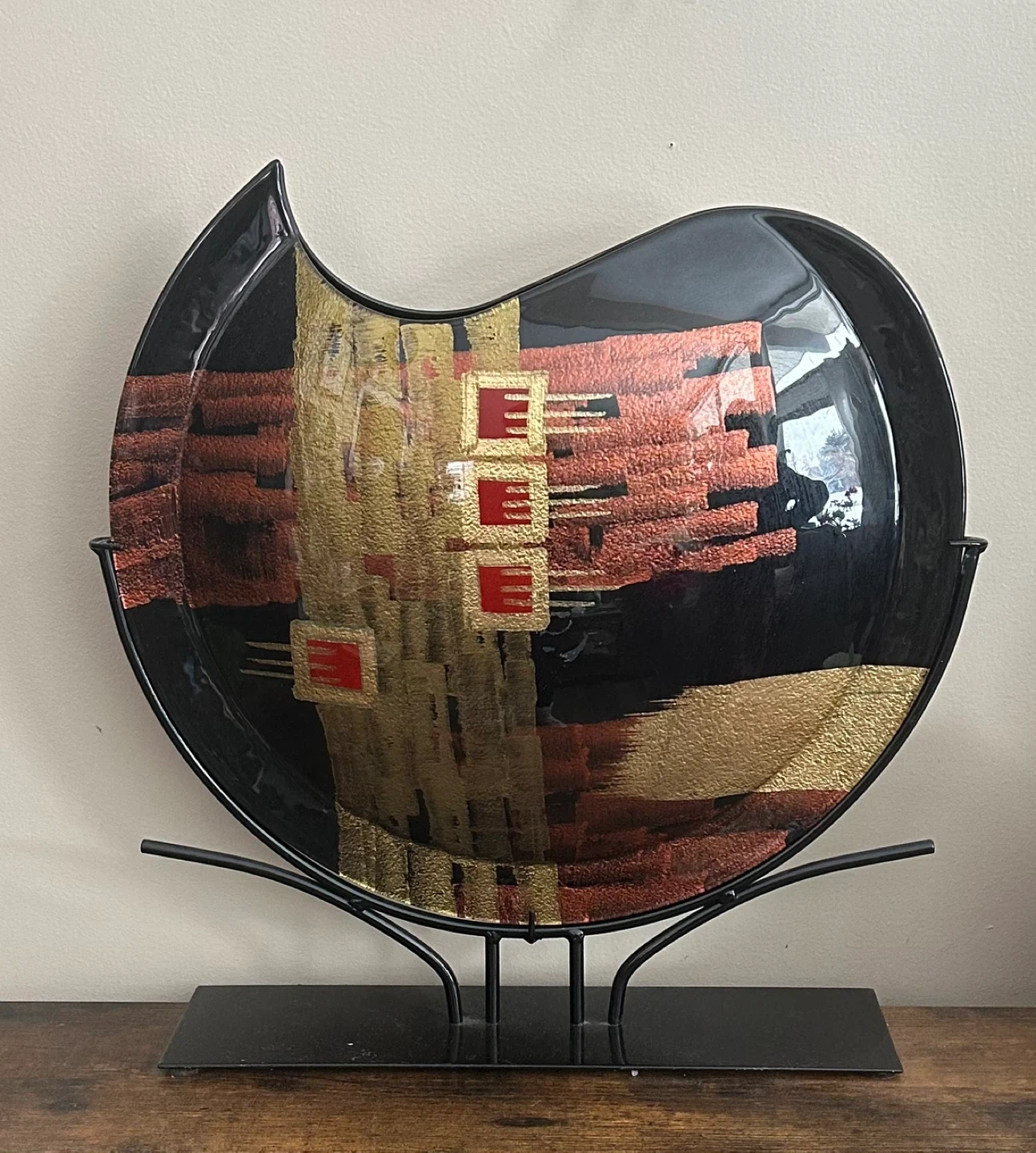 Unique decorative plate with a black and gold design, complete with a stand. It would look great as a centrepiece or on a shelf!