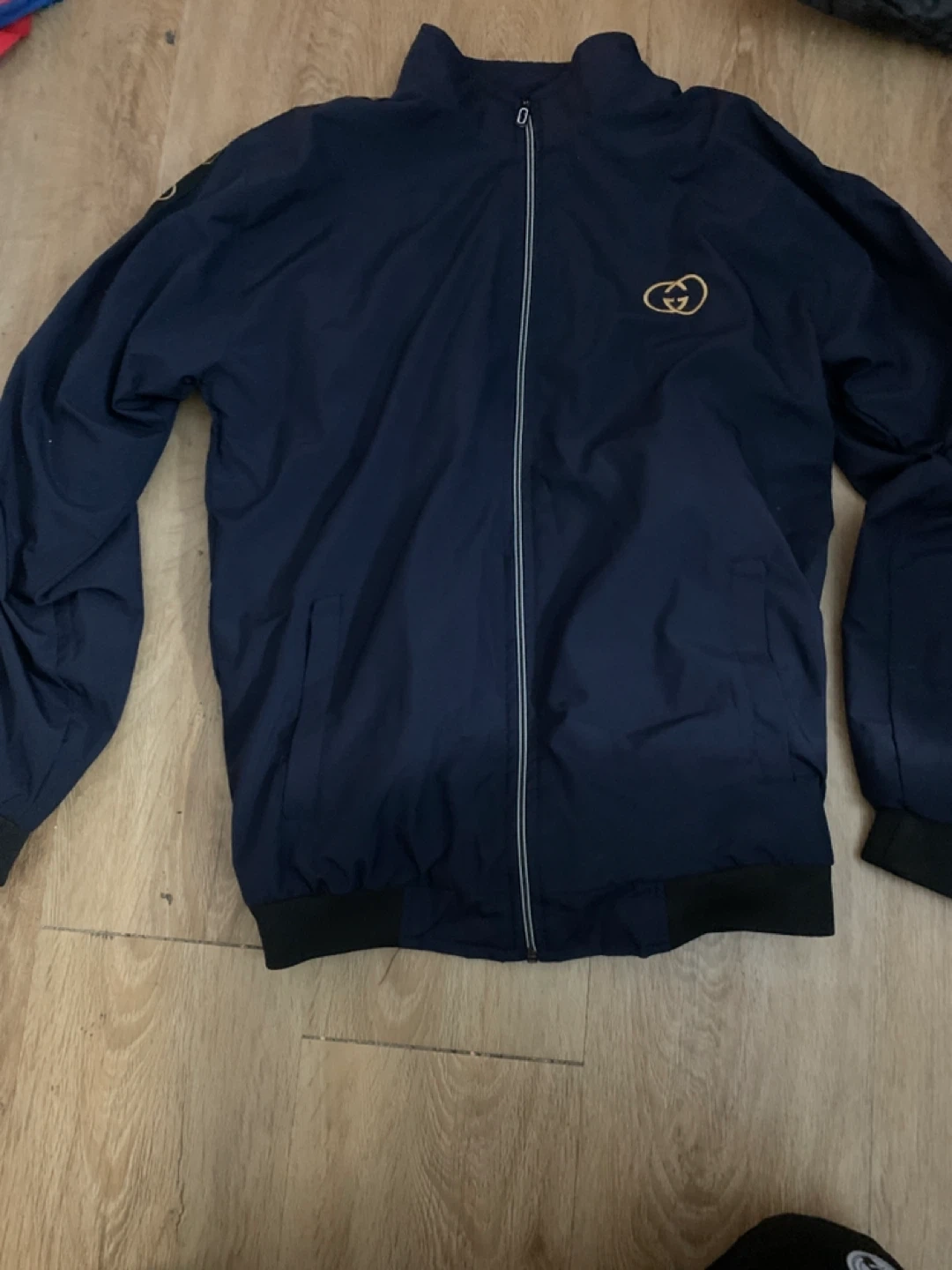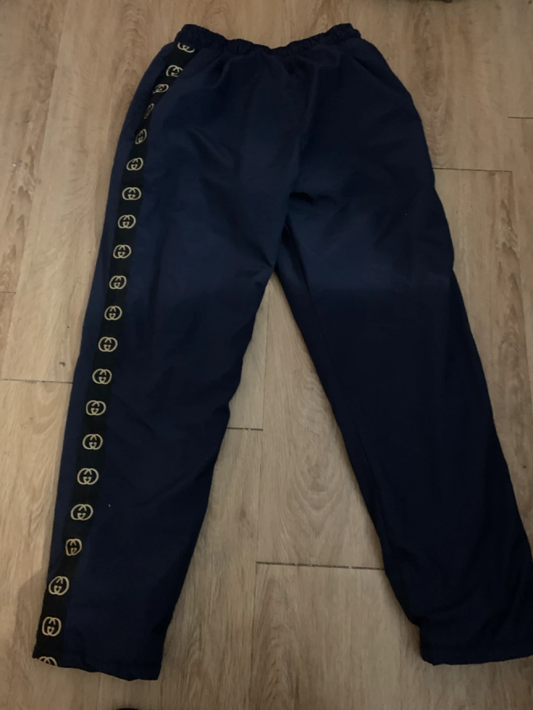 Selling a Gucci tracksuit in size XL. It's a navy blue colour and features the Gucci logo on the sides of the pants and on the jacket. Made in Italy