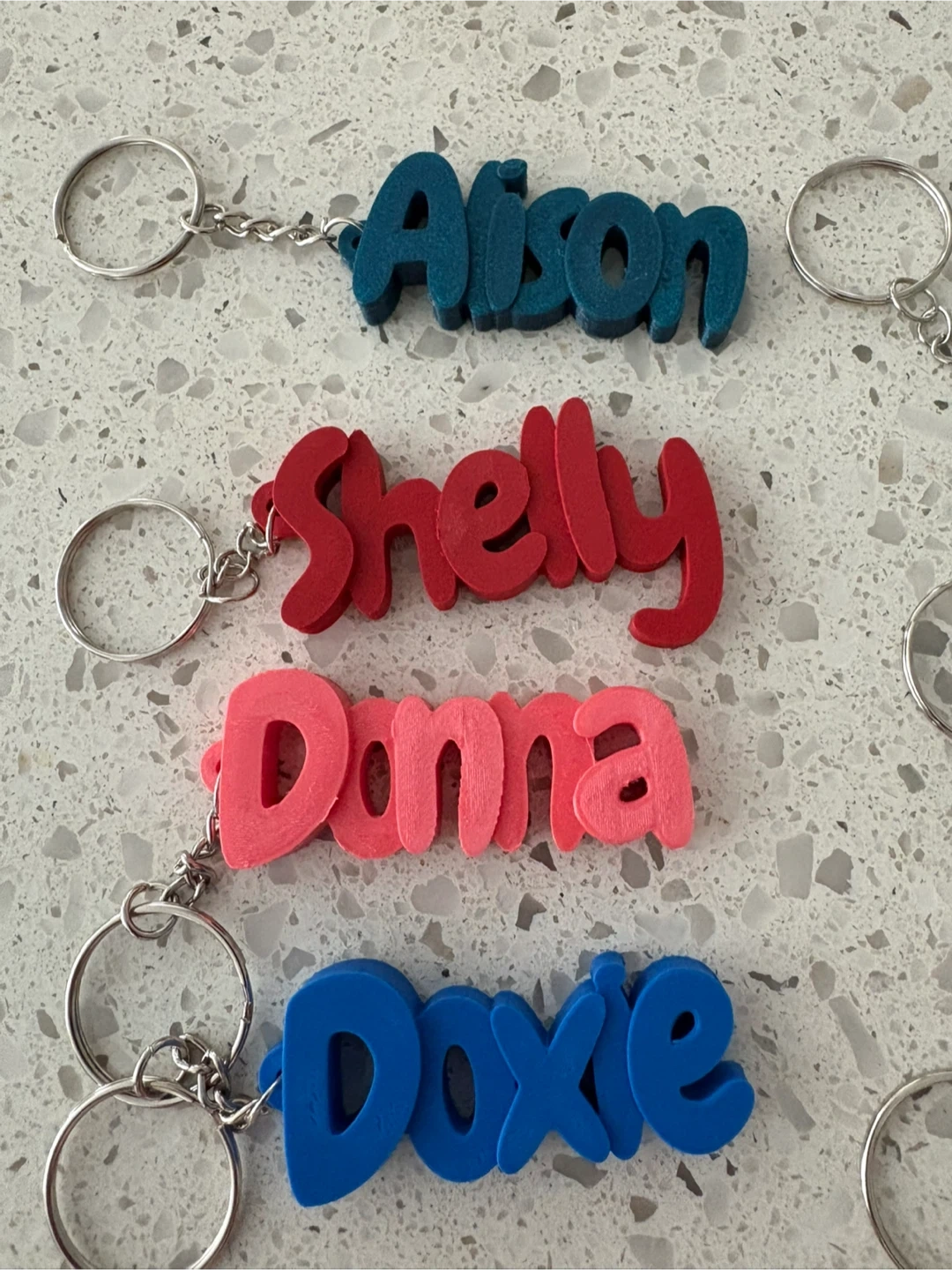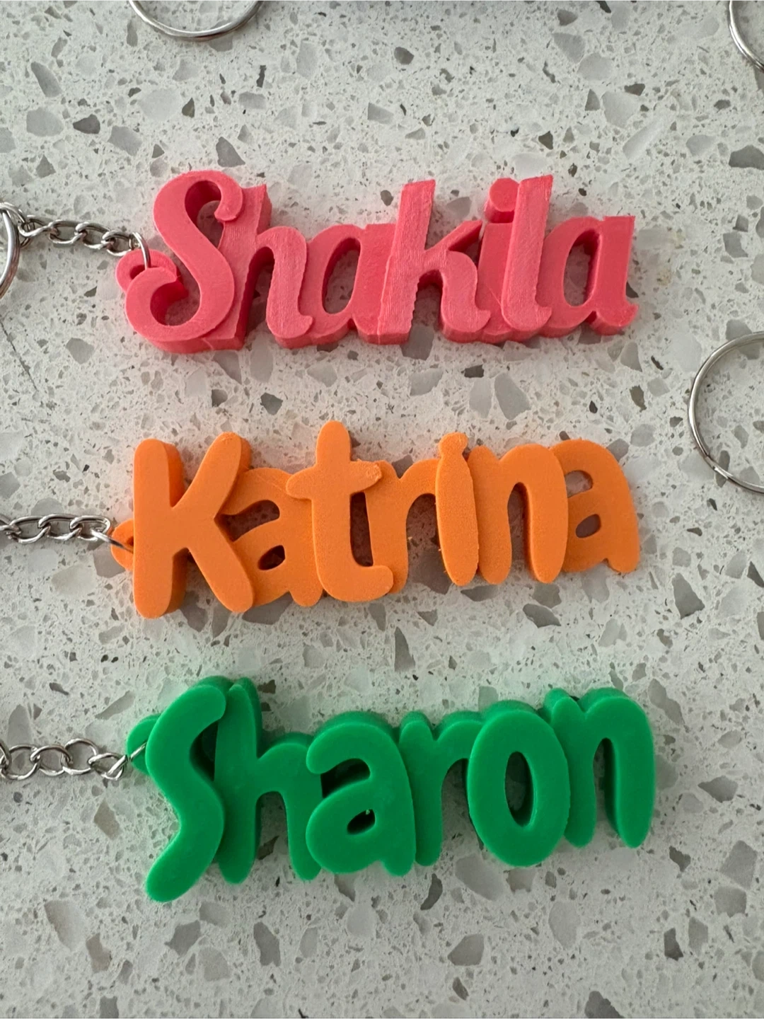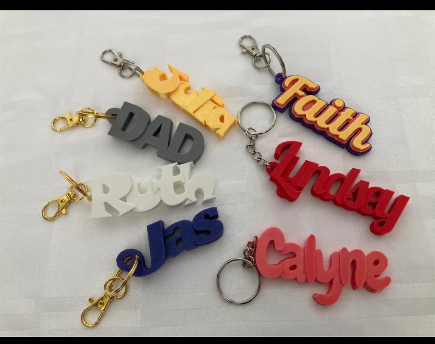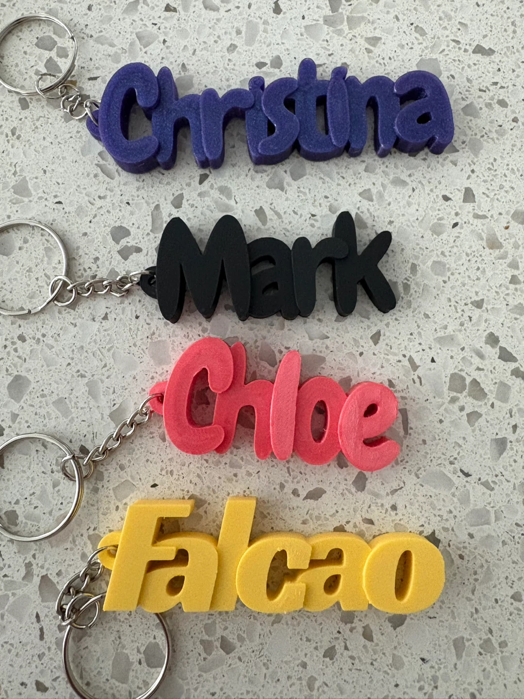 Get your own personalized 3D printed name keychain! These keychains come in a variety of colours, perfect for adding a personal touch to your keys, backpack, or anything else you want to accessorize. A fun and unique way to show off your name or a loved one's!