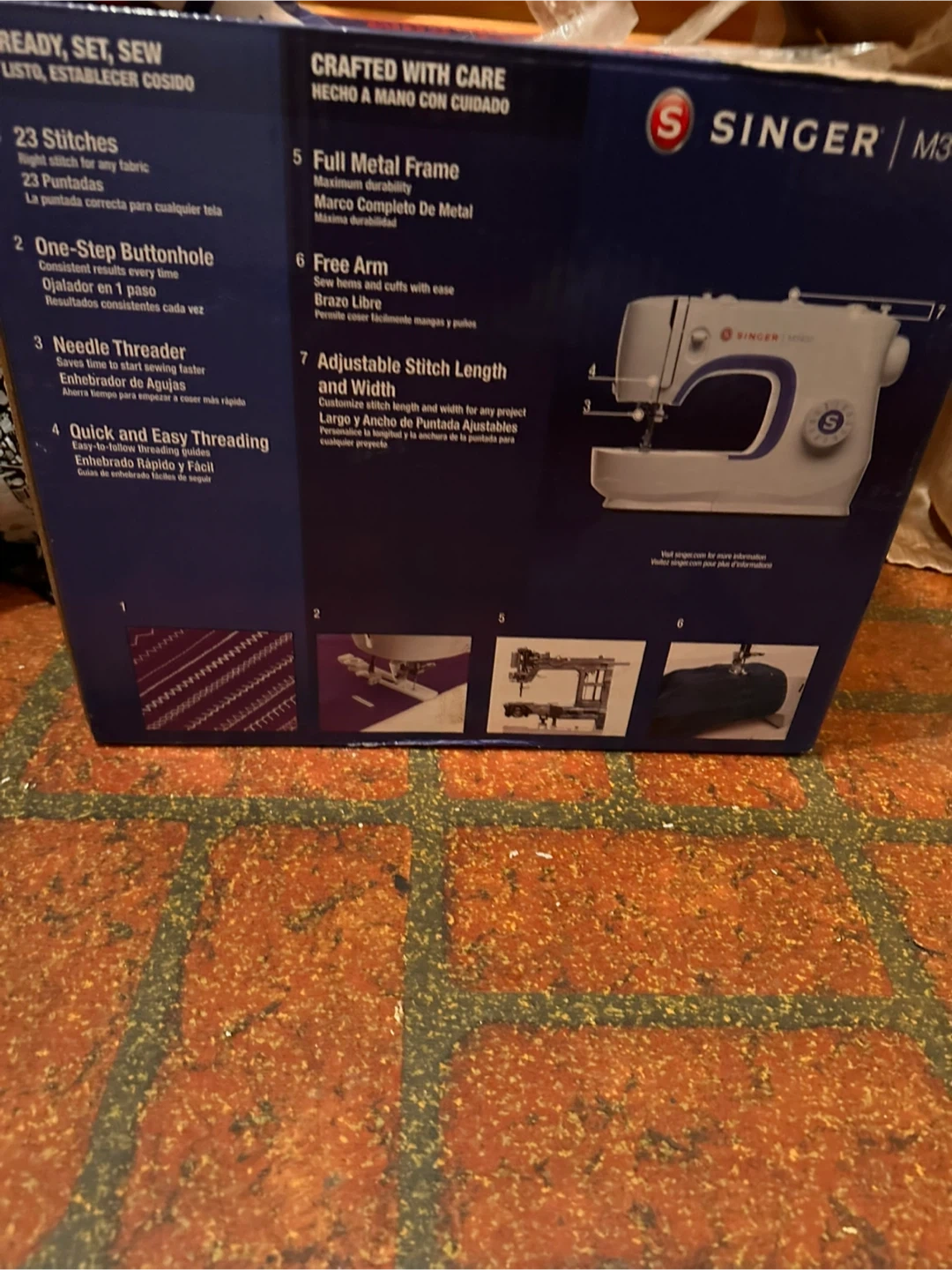 Selling a Singer M3400 sewing machine in excellent condition! It features 23 stitches for any fabric, a one-step buttonhole, and a needle threader to save time. It also has a full metal frame, a free arm, and adjustable stitch length and width. Quick and easy threading makes it simple to get started on your sewing projects. The box is included!