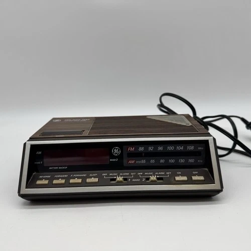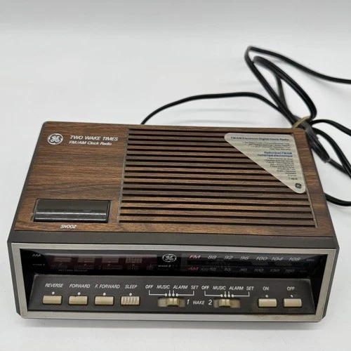 Vintage GE (General Electric) FM/AM Clock Radio with classic woodgrain styling. This is a solid-state electronic clock radio featuring dual wake alarms and battery backup.