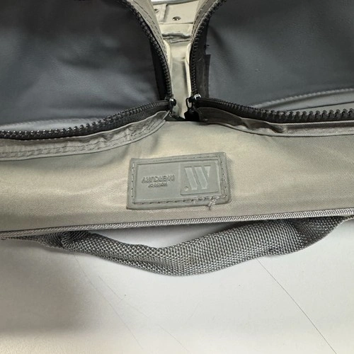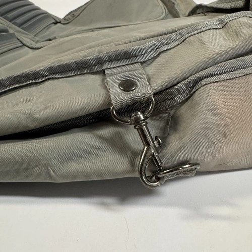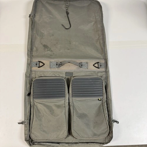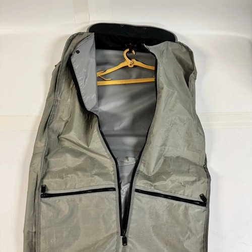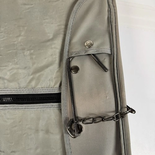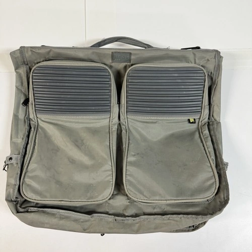 Vintage House of Mercury garment bag / suit carrier, made in Australia. Synthetic fiber construction with heavy-duty zippers, multiple compartments, and built-in hanger/chain system. Ideal for travel or clothing storage.