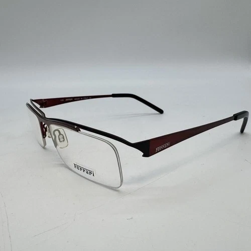 Authentic Ferrari eyeglass frames in a sleek semi-rimless design. These premium frames feature a metallic burgundy finish with Ferrari branding on the temples. Made in Italy with high-quality craftsmanship. Comes complete with the original Ferrari case, cleaning cloth, and authenticity card.